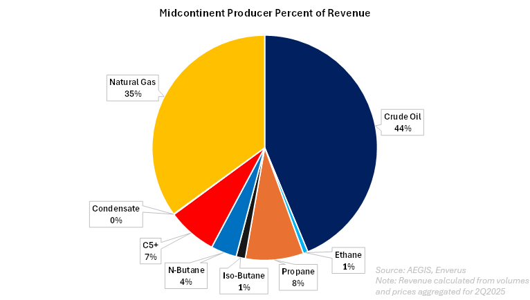 In our representative Midcontinent producer, volume and revenue splits are very different than those in the Permian basin. Again, we use AEGIS Revenue Intelligence to get exact volumes for a useful sample of meters going to processing plants. Compared to the Permian basin, Midcontinent crude oil volumes were a much smaller proportion; NGLs and natural gas, larger. Here we show crude oil represented 18% of wellhead volumes, 26% NGLs, and the majority (56%) residue or dry-gas production.