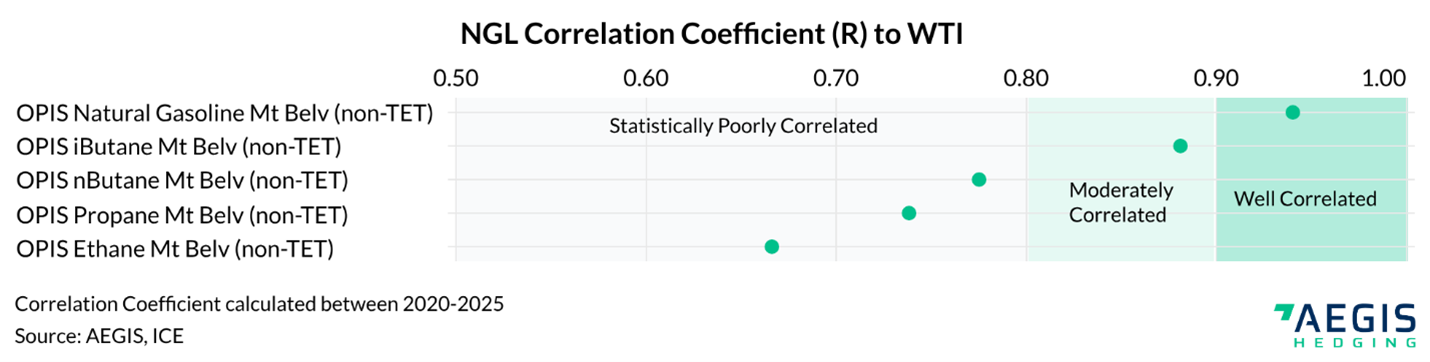 Producers that do not hedge NGLs are overlooking a material source of risk to revenue, especially in oil and rich-gas plays where NGL contributions can be significant. In oil-focused plays, AEGIS data show NGLs can generate up to three times more revenue than natural gas. It’s possible to know precise exposures with a complete understanding of both contract terms and verified revenue receipts. Importantly, the underlying prices can be hedged via individual financial contracts. While liquidity does vary by purity product, it is generally sufficient out 12 to 24 months without meaningfully impacting market prices. Notably, some NGL prices are idiosyncratic and do not reliably correlate with crude oil or natural gas prices, reinforcing the benefit of explicitly hedging NGLs.