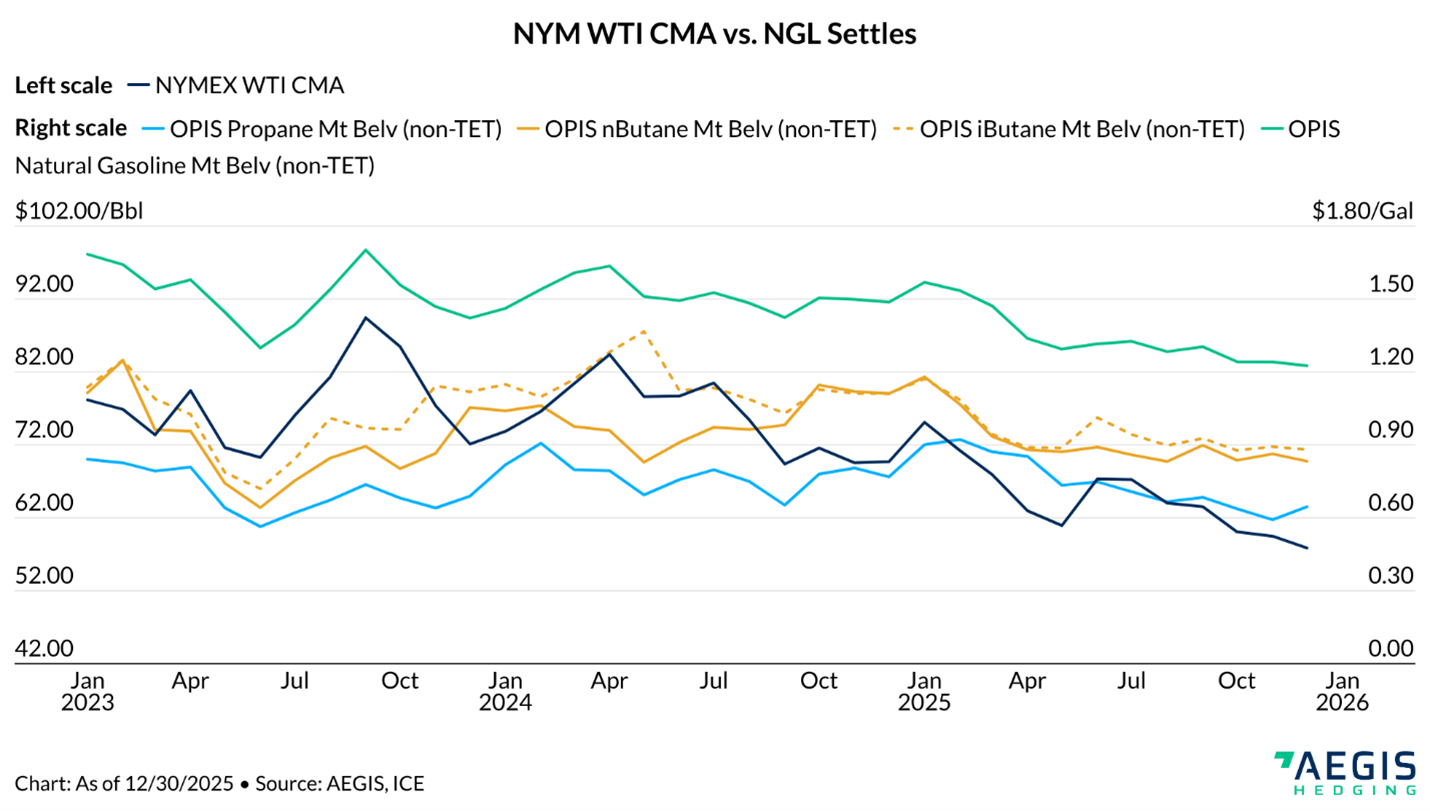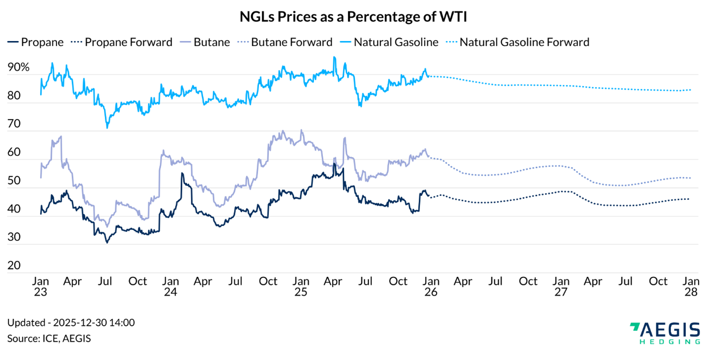 A disciplined NGL hedging program requires a clear understanding of historical and forecasted NGL production by purity product over the one- to two-year hedging horizon, supported by robust monitoring of relevant pricing curves and integrated valuation alongside crude oil and natural gas hedges. Adopting this approach represents industry best-practices and enables more effective risk management. We recommend evaluating the potential benefits of NGL hedging within this framework and engaging with your AEGIS trader to assess appropriate strategies. If you’d like to stay up-to-date on how supply/demand fundamentals are influencing the individual purity products you can do so HERE.