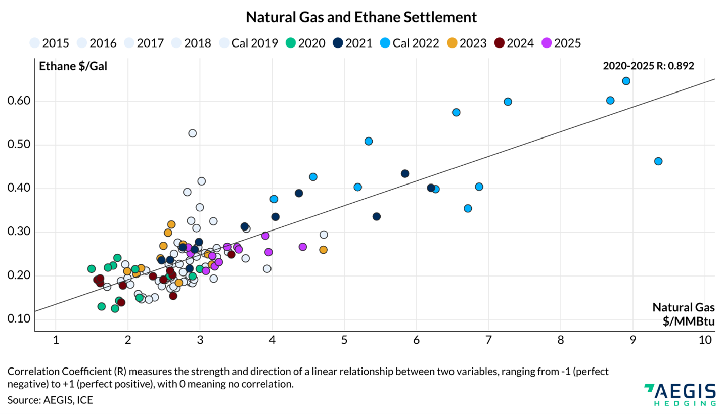This correlation is confirmed when the settlements are plotted together as a scatterplot, shown below. The monthly settled price for Henry Hub is plotted on the horizontal axis while the monthly settled price for Ethane is plotted on the vertical axis.
