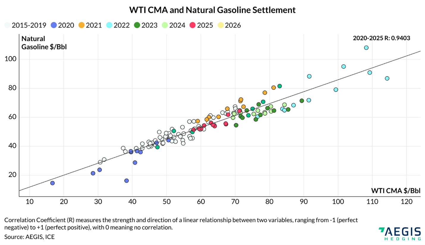 Natural gasoline is the most chemically similar to crude oil among the NGLs, and it is sometimes sold in the physical market on a WTI basis. The high correlation makes sense.