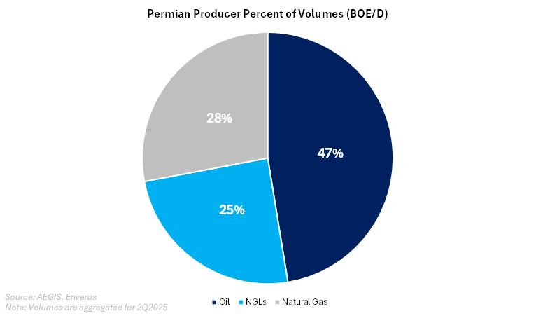 The chart below shows the production split of a typical Permian oil and gas producer. The quantities are wellhead volumes, before adjustments for revenue interest (i.e. represent 8/8ths). Units are converted to barrels of oil equivalent or BOE for comparison. In our example, the typical Permian producer was 47% oil, 25% NGLs and 28% dry gas or residue gas by volume in the second quarter of 2025.