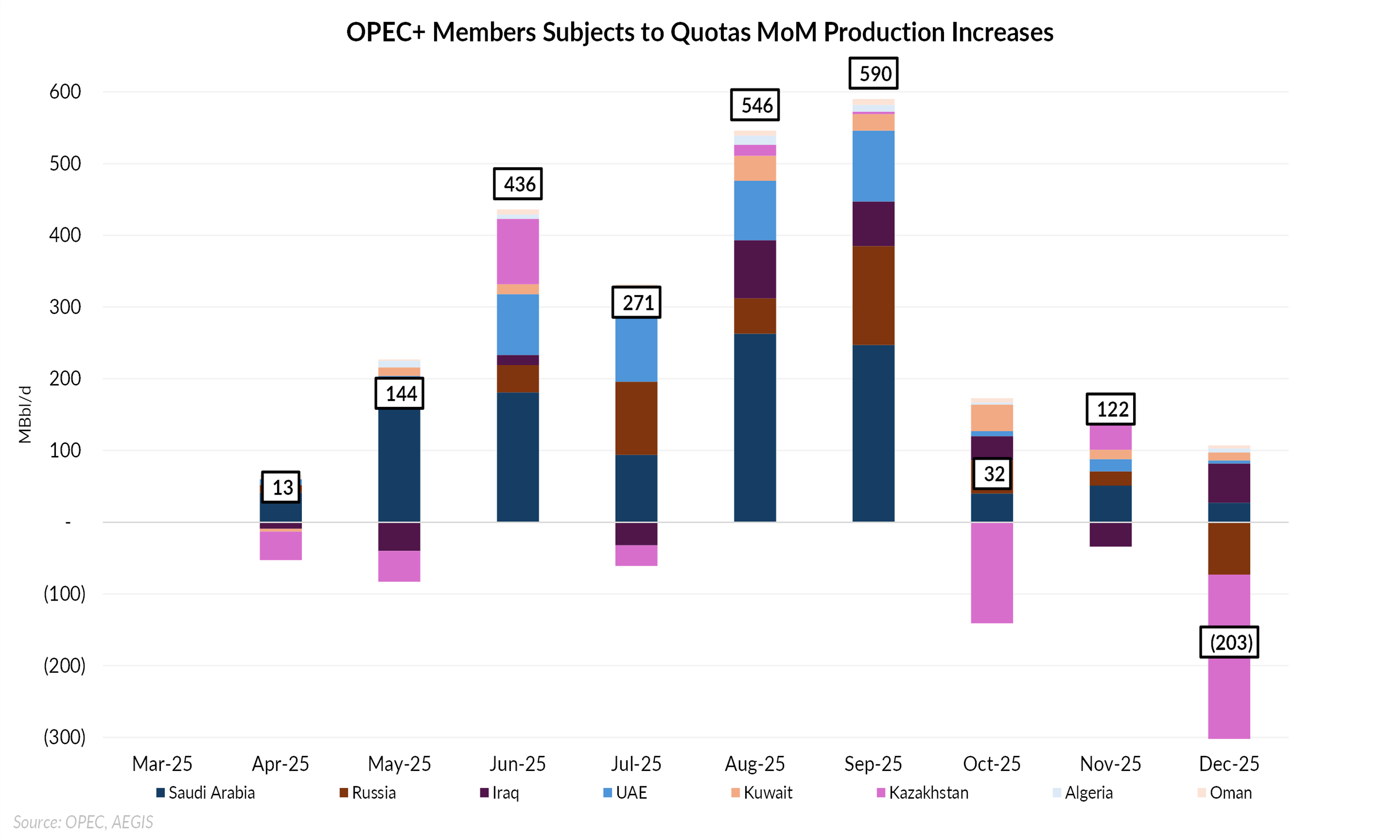 OPEC data confirms the impact on Kazakhstan’s production. According to the latest Monthly Oil Market Report, Kazakhstan’s crude output fell from 1.759 MMBbl/d in November to 1.522 MMBbl/d in December, a decline of roughly 237 MBbl/d month-on-month. This move is reflected in the first chart, which tracks month-over-month production changes among OPEC+ members subject to quotas since April, when OPEC+ began unwinding previously stalled production. Kazakhstan’s output fell sharply in December as disruptions at the CPC export system constrained flows.
