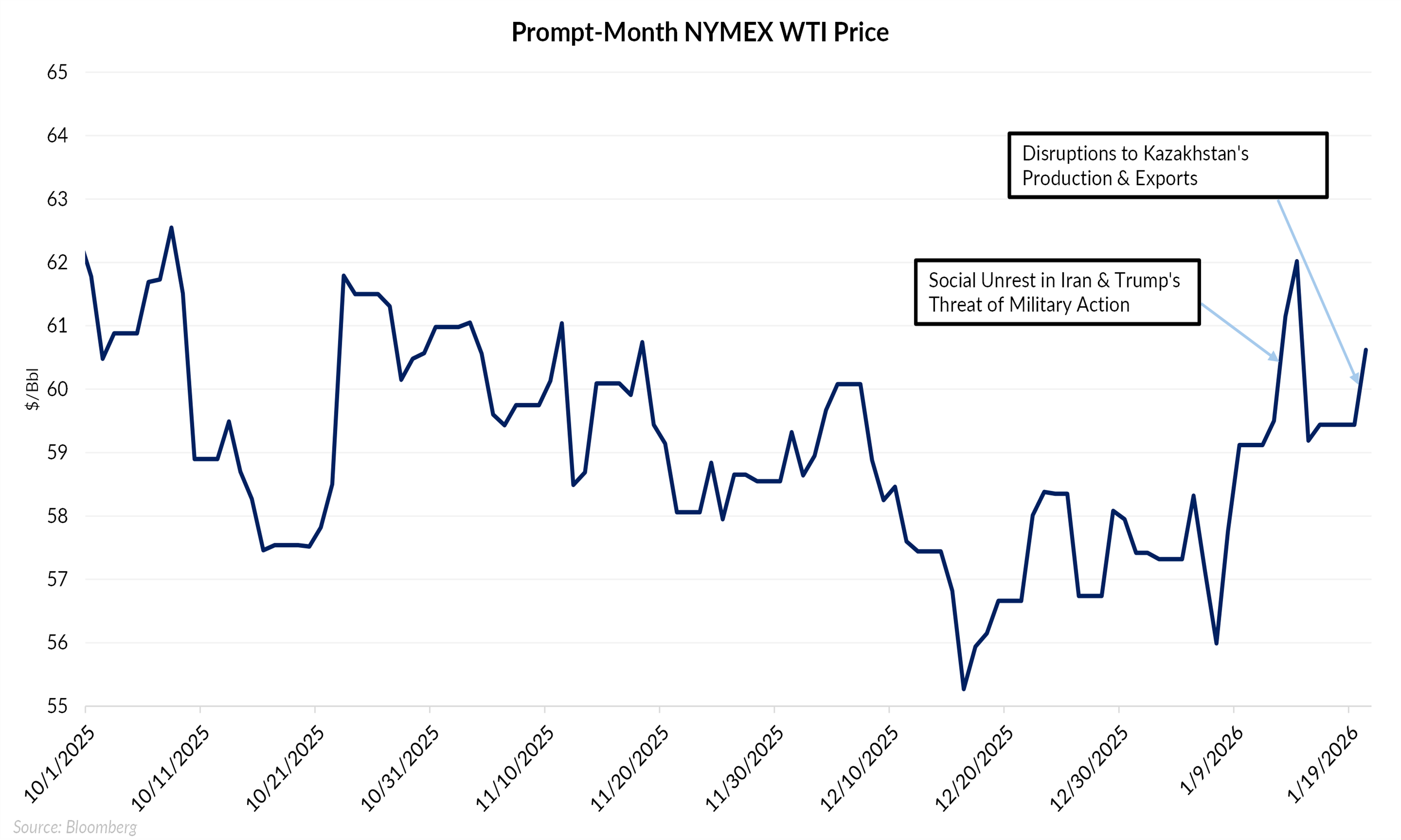 Early in the week, crude prices rose as the market repriced near-term physical availability, with disruptions in Kazakhstan supporting prices. As shown in the second chart, last week’s price spike was driven primarily by heightened geopolitical risk tied to tensions around Iran and U.S. rhetoric regarding potential military action, while this week’s rally was likely more closely linked to Kazakhstan-related supply disruptions.