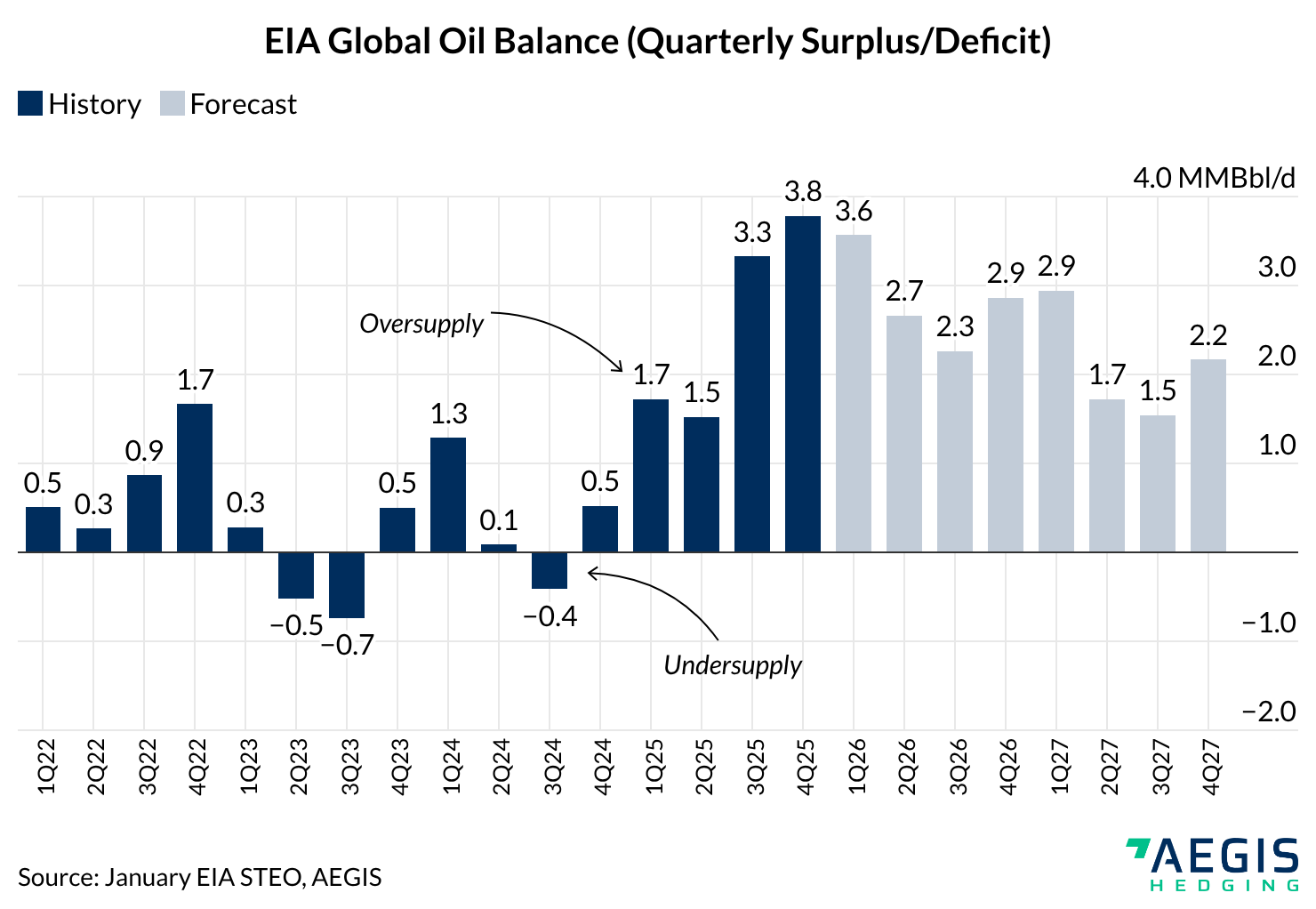 The latest EIA Short-Term Energy Outlook reinforces that these episodic disruptions are unfolding against a backdrop of persistent oversupply. As shown in the third chart, the STEO forecasts continued global inventory builds through 2026, with implied stock increases averaging roughly 2.8 MMBbl/d as production growth continues to outpace demand.