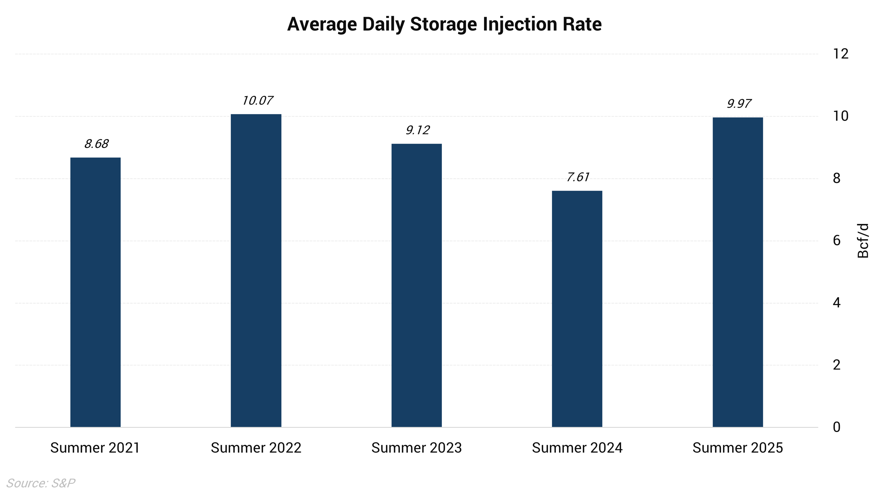 The chart above shows the change in average daily supply-demand components this summer compared to summer 2024. Despite the -2.8 Bcf/d year-over-year decline in power burn, total demand has actually increased, driven by LNG feedgas. However, this 1.28 Bcf/d increase in demand is swamped by the 4.6 Bcf/d increase in supply. This mismatch has resulted in storage injections exceeding last summer’s rates by 2.81 Bcf/d. If this summer was not as mild as it has been and weather had been normal, power burn would be higher, but likely still negatively impacted by a combination of more renewable generation and higher gas prices encouraging higher coal consumption.