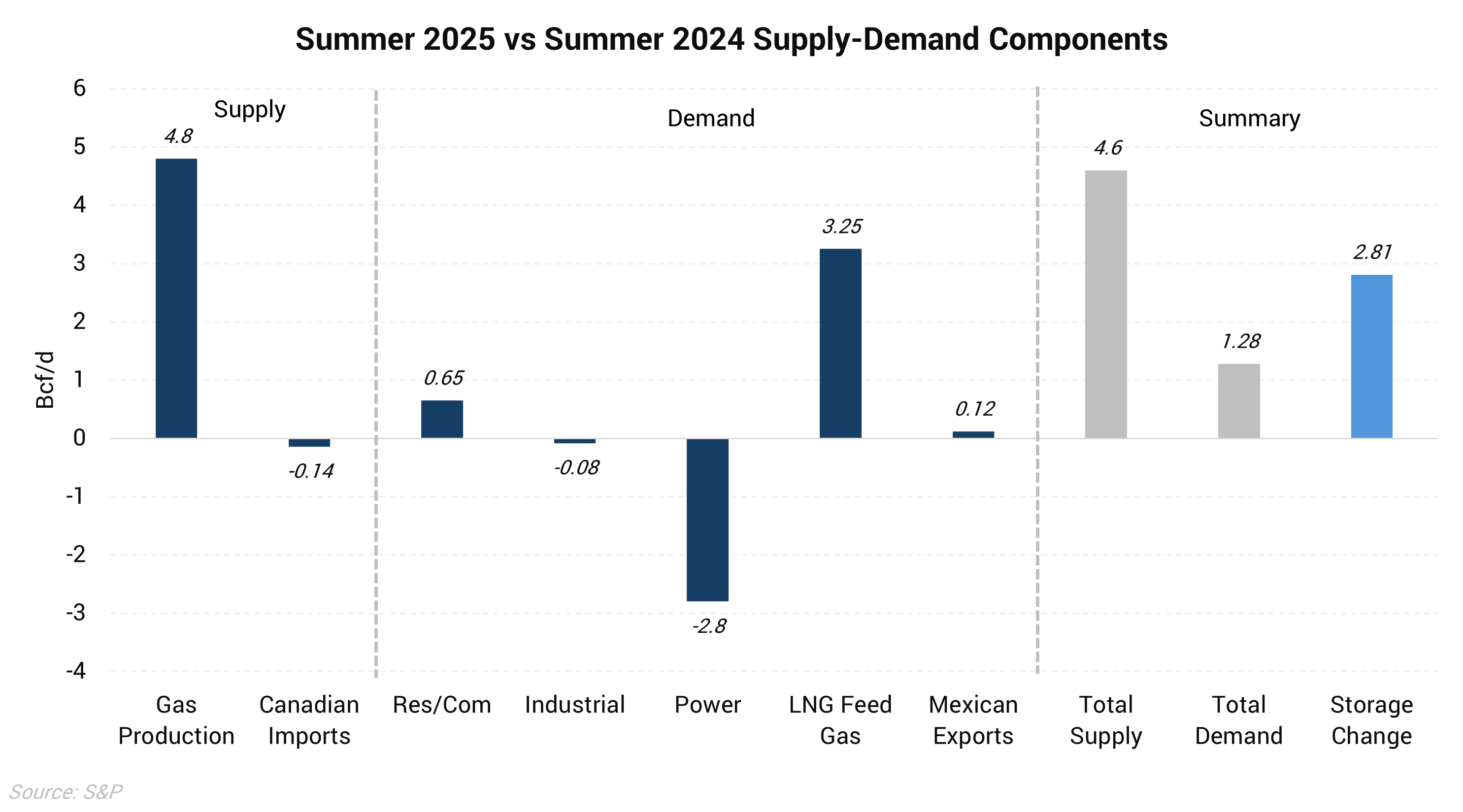 The chart above shows the average daily storage injection rate over the past four summers, and the average rate of injections so far in Summer ’25. Storage builds have averaged almost 10 Bcf/d this summer, more than 2 Bcf/d higher than last summer. This summer is almost the highest rate of the past several years, with only 2022 being higher. Price has a lot to do with this, as last summer prompt gas prices were at multi-year lows and storage was already above average to start summer. When further breaking down the year-over-year changes in fundamentals it becomes clearer why storage has built so quickly this summer compared to 2024.