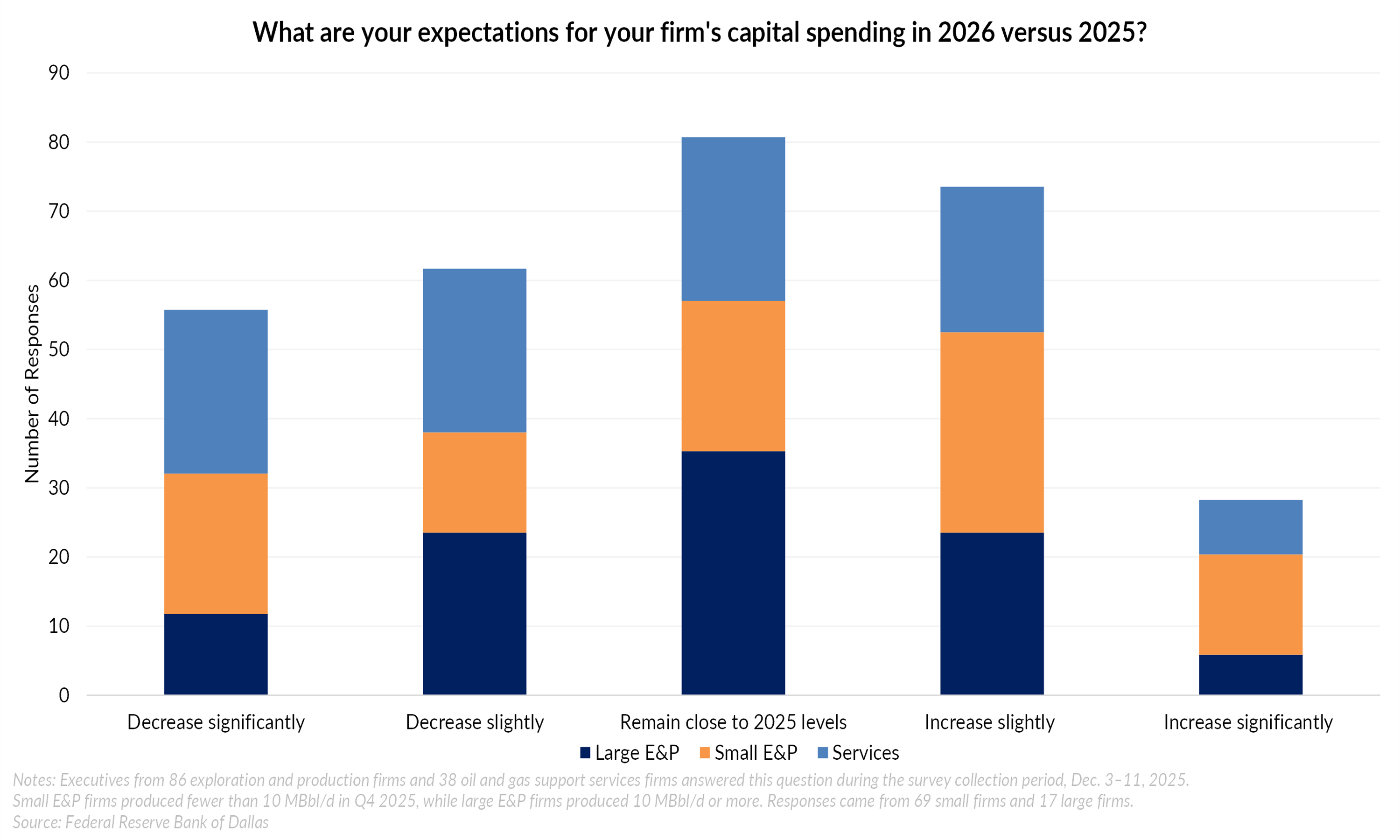However, capital planning tells a different story. Firms reported using an average WTI price of $59 per barrel to plan 2026 spending, well below the $68 used in 2025 budgets. This reset highlights a deliberate shift toward conservative assumptions, emphasizing downside protection over upside participation. In effect, firms may expect prices to improve, but they are unwilling to base investment decisions on that outlook.