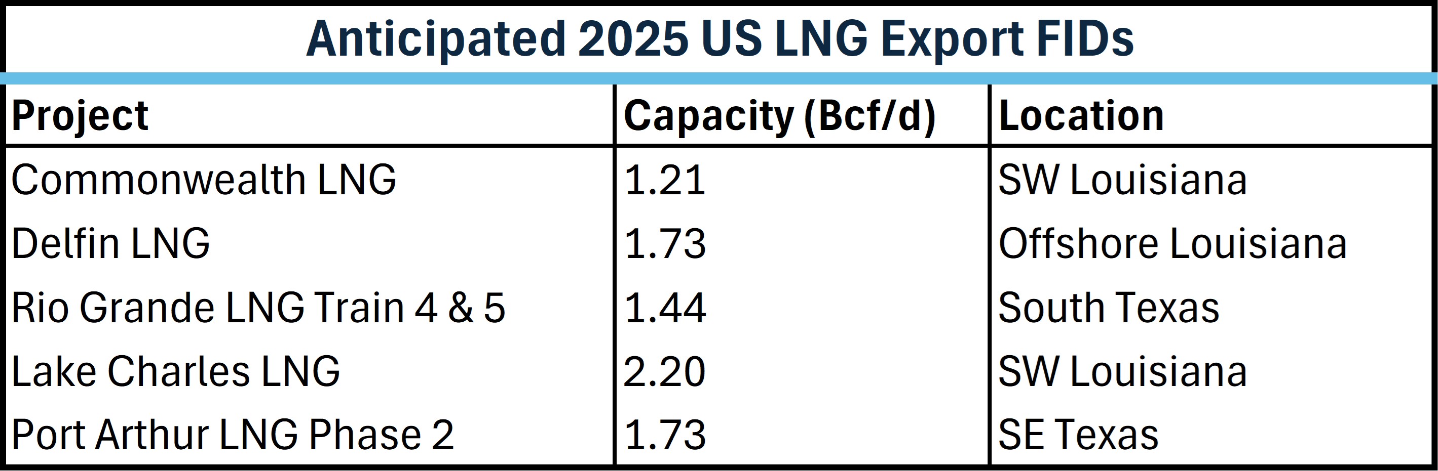 The table above shows the list of projects expected to secure a final investment decision by the end of 2025. These projects are currently in the process of securing permits from federal regulators and offtake agreements with buyers. Once enough agreements are signed, a final investment decision is made. These projects represent a total of 8.31 Bcf/d, and while many of these will not begin commercial service until the early 2030s, it does show that developers are continuing to be aggressive in bringing new capacity online.