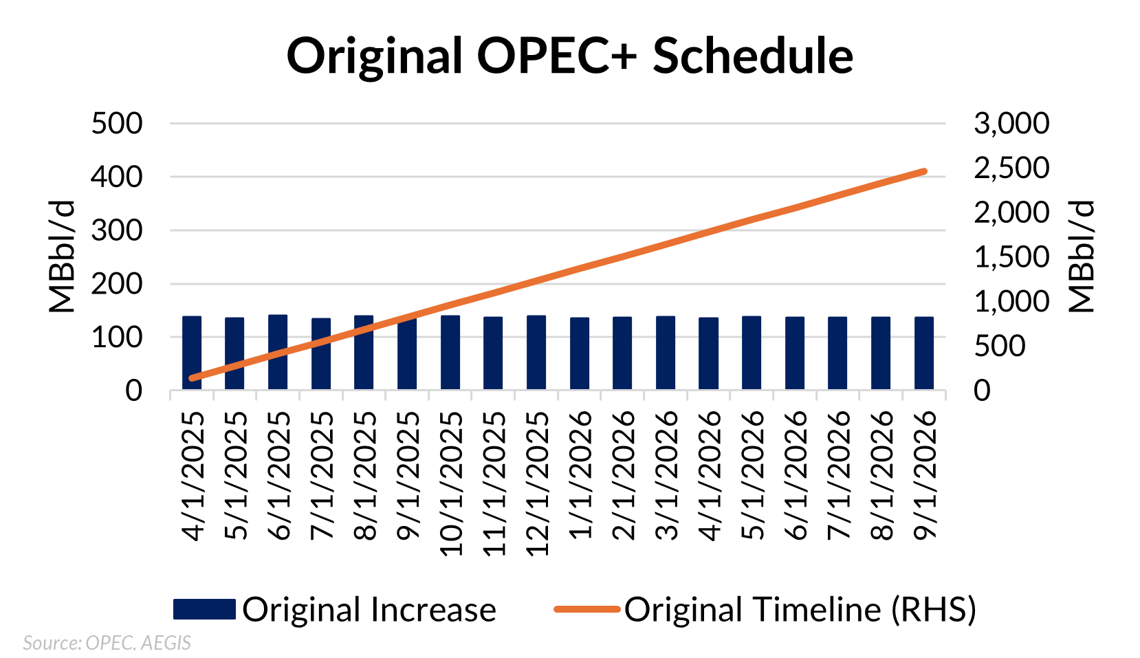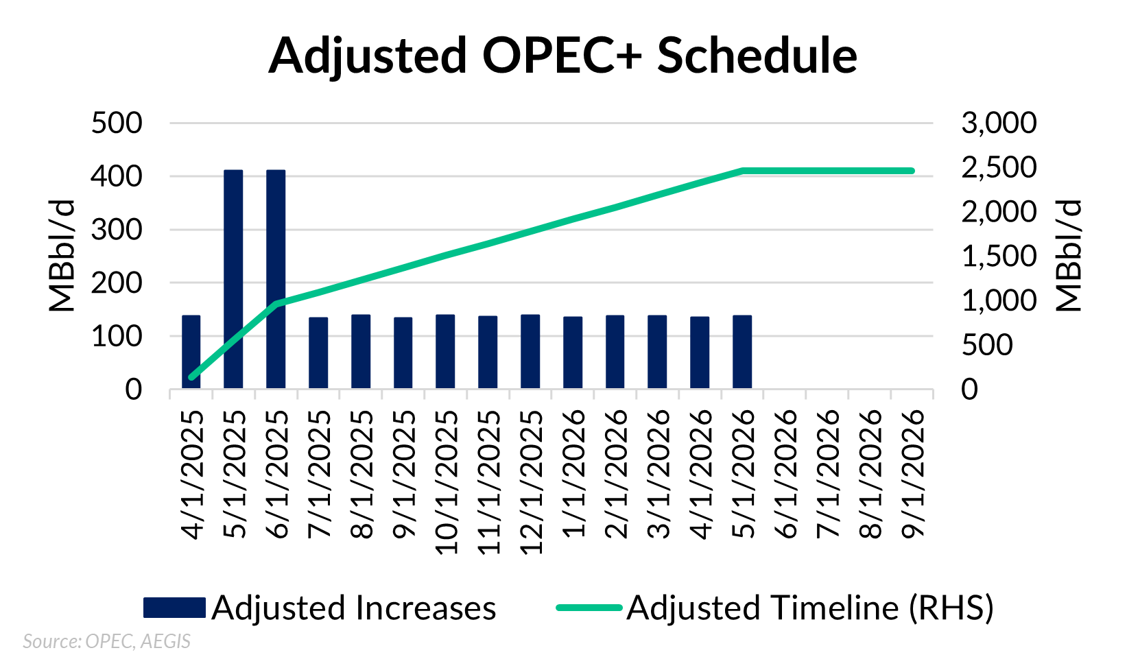 OPEC+ is in the process of reversing its 2.2 MMBbl/d in voluntary production cuts and allowing the UAE to increase its quota over time. The original schedule (first chart) called for gradual monthly increases of 0.138 MMBbl/d from April 2025 through September 2026. However, the group has accelerated the timeline, implementing 0.411 MMBbl/d hikes in both May and June this year. As shown in the updated schedule (second chart), the group is on track to restore nearly 1 MMBbl/d of voluntary cuts in just three months.