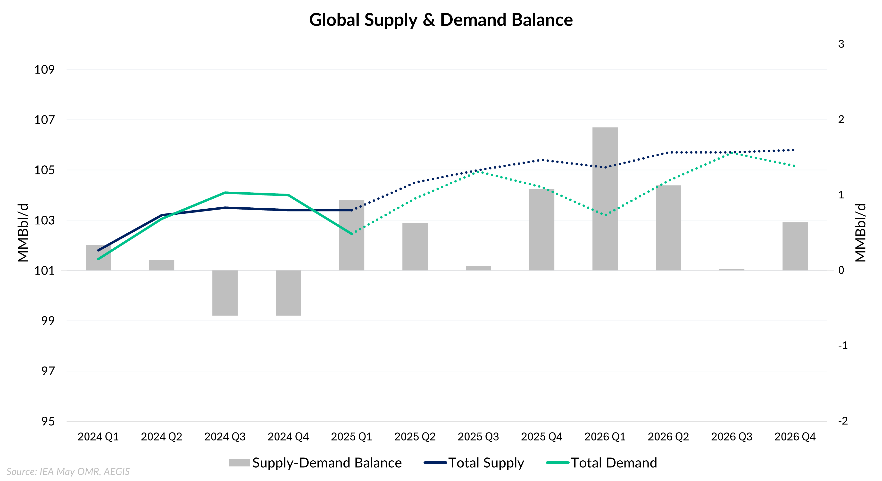 OPEC+ is scheduled to meet again on June 1 to determine July production levels. Unless major overproducers rein in output, Saudi officials have signaled that additional supply could be released. With the IEA projecting a persistent supply surplus through 2026, especially in early 2026 when inventories are expected to build sharply, no clear enforcement mechanism in place, the group risks pushing the market into a structurally oversupplied environment, testing how much crude the global economy can realistically absorb.