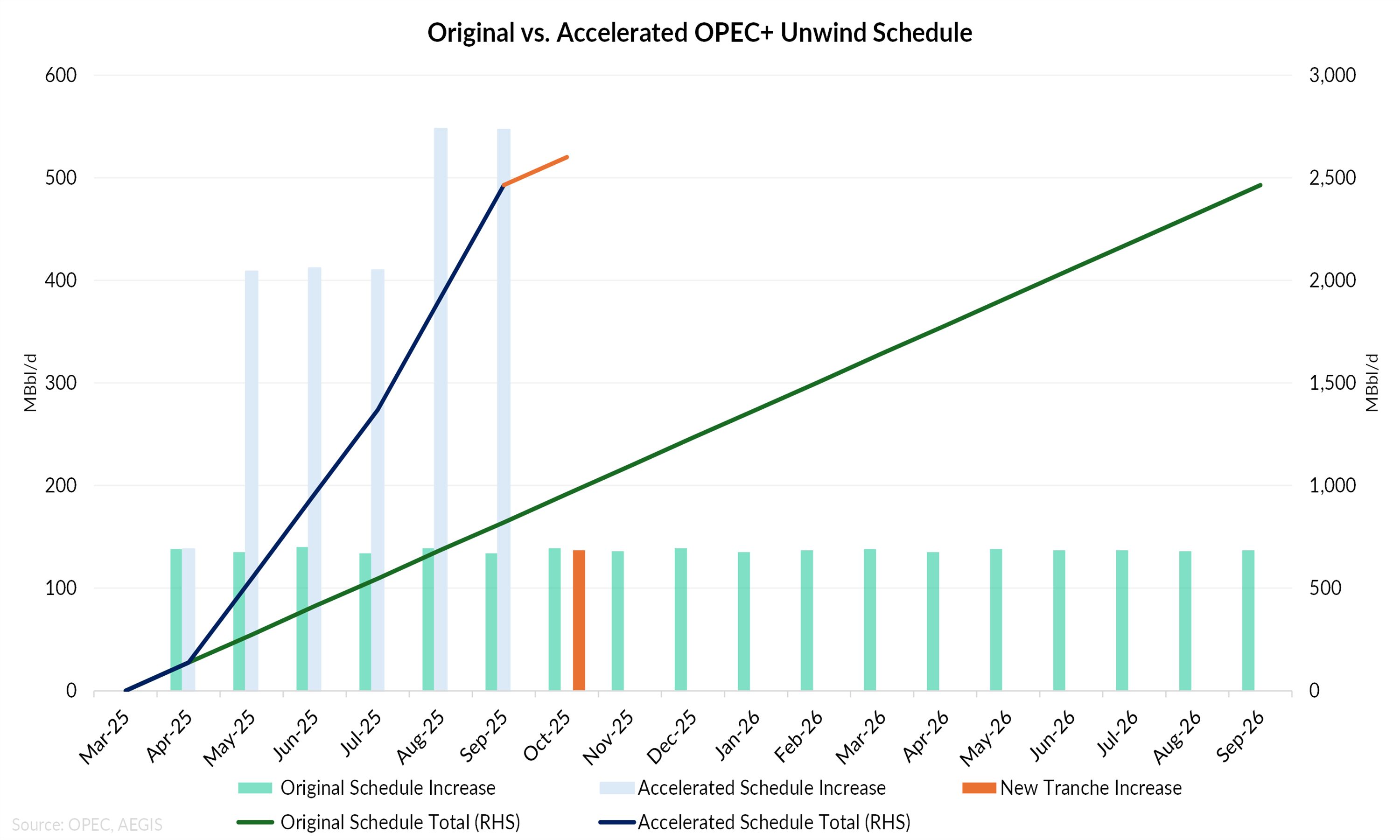 OPEC+ announced it will raise the group’s production quota by 137 MBbl/d for October, marking the start of unwinding 1.66 MMBbl/d of voluntary cuts that were originally planned to stay in place through the end of 2026.