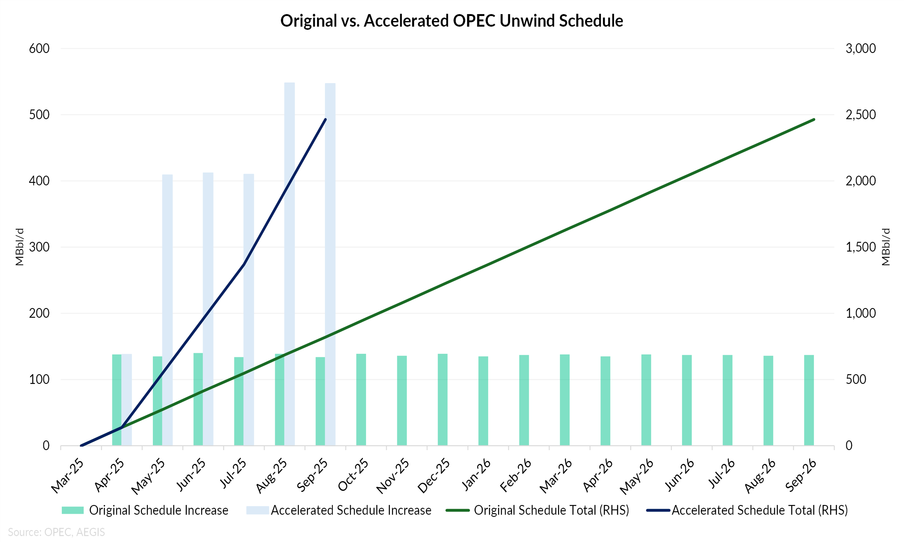 OPEC+ announced a 547 MBbl/d production quota increase for the month of September, completing the reversal of the group’s November 2023 supply cuts a full year ahead of schedule. The move brings the total unwind to approximately 2.5 MMBbl/d, including the 300 MBbl/d hike allocated to the UAE.