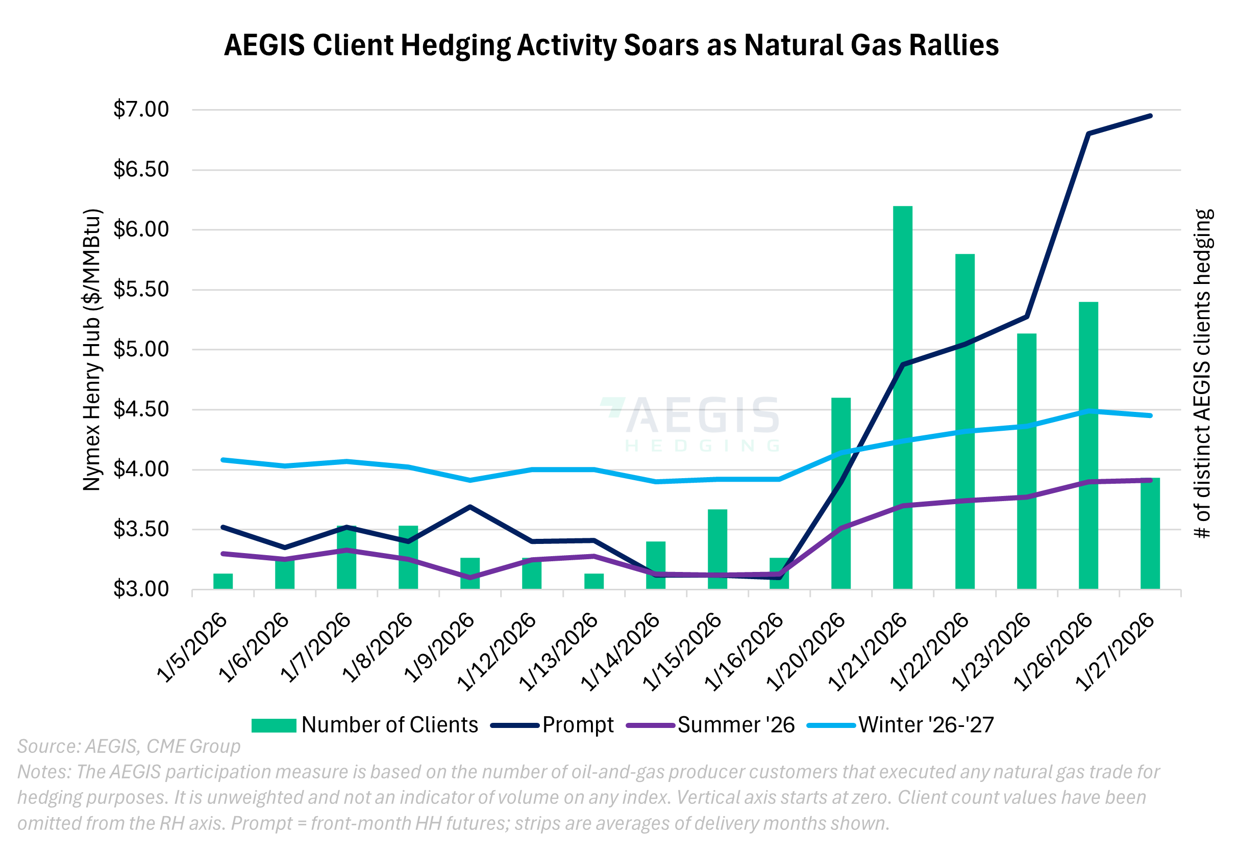 AEGIS manages a significant share of U.S. oil and gas hedging activity as the largest independent hedging advisory firm in the country, providing a unique view into how producers respond to major shifts in the forward curve. The recent surge in participation highlights how quickly commercial hedgers move to de-risk when volatility creates attractive pricing windows.