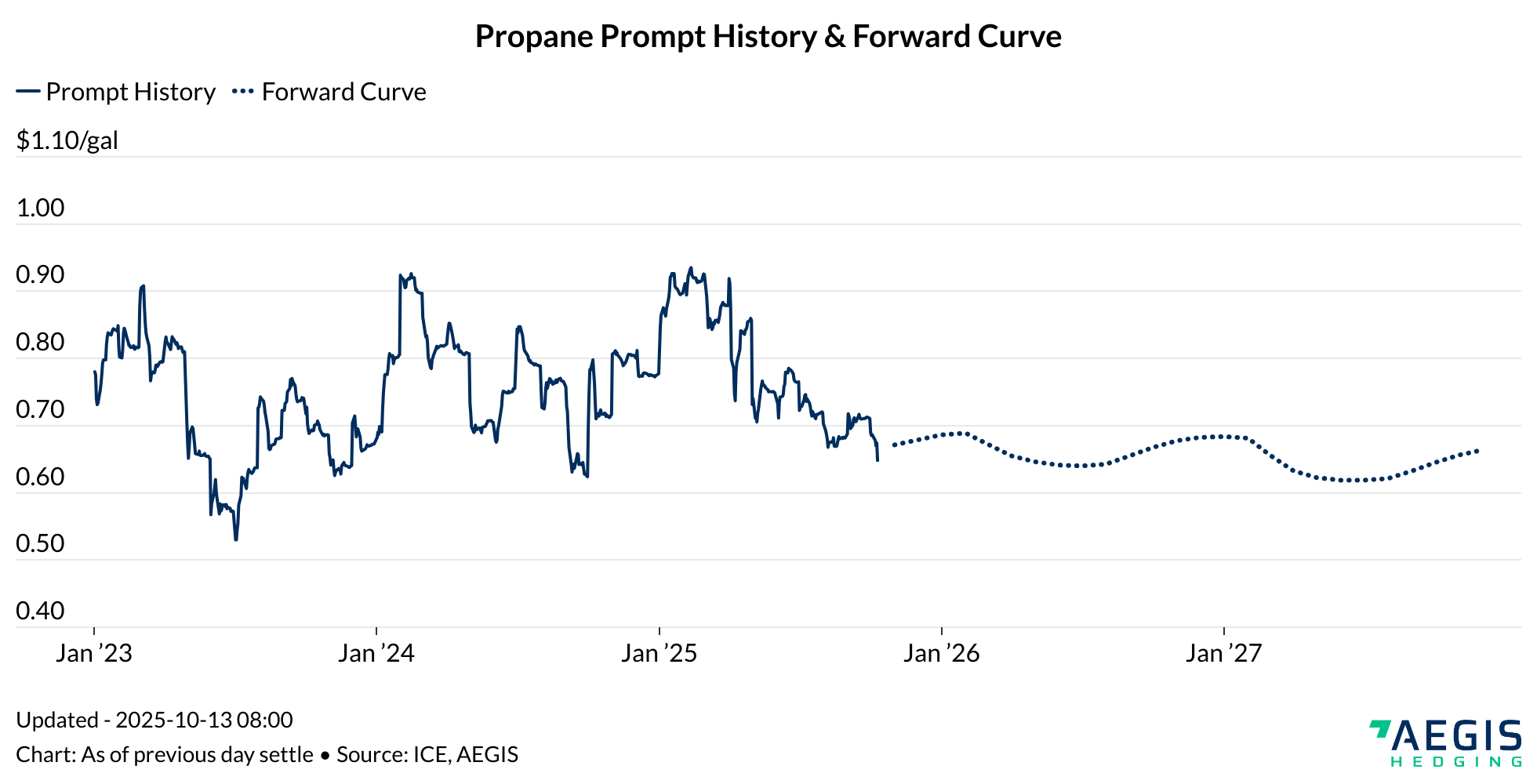 The combination of new LPG export capacity and slower supply growth could tighten propane fundamentals over the next two years. However, the outlook for oil prices over the next 18 months skews bearish, which could weigh on propane prices despite tighter market conditions. As of October 7, Mont Belvieu propane was priced at $0.68/gal, with the forward curve in backwardation for the next two years.