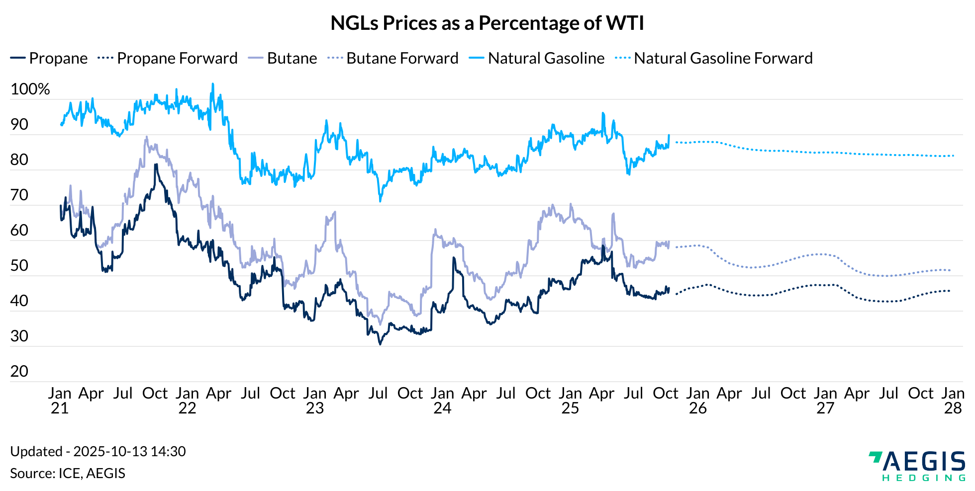 There are two main components that influence propane prices. First, propane has its own discrete supply and demand balance. Second, it maintains a relationship with crude oil because both are part of the same hydrocarbon value chain, linking propane’s pricing dynamics to crude oil–derived economics. With that in mind, it’s important to consider propane’s relative value to WTI.