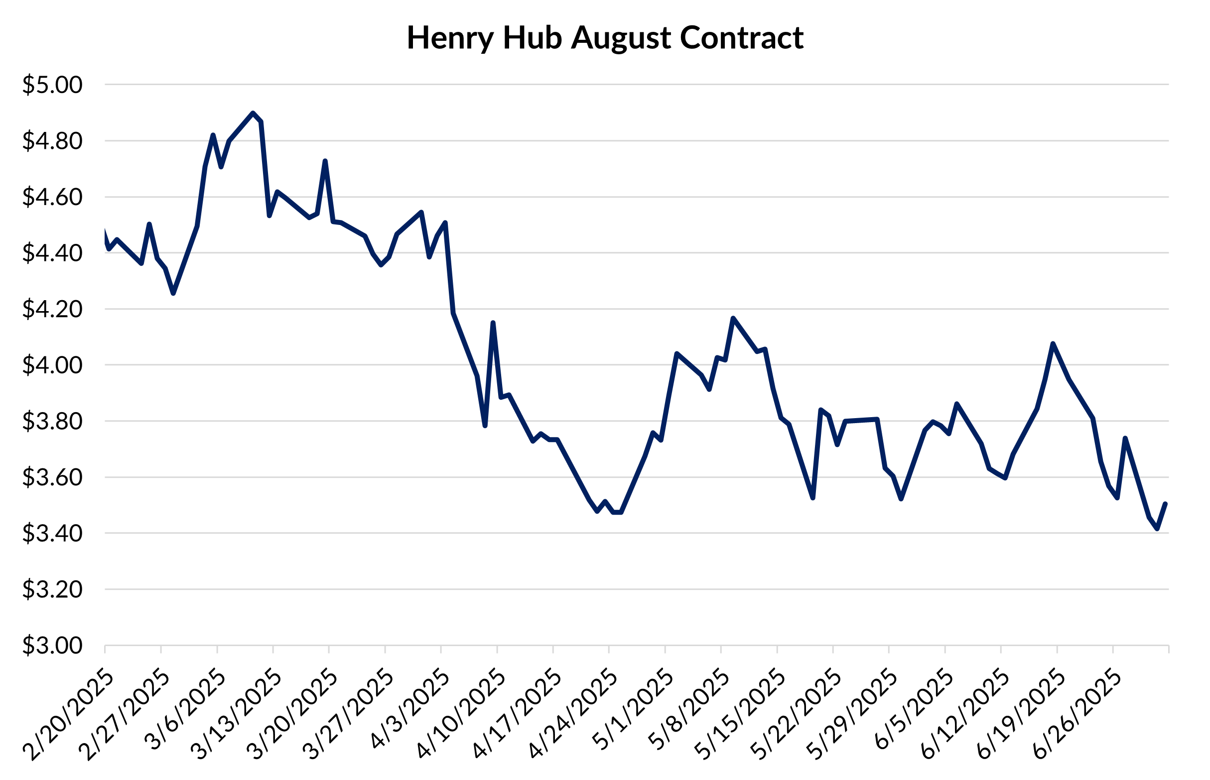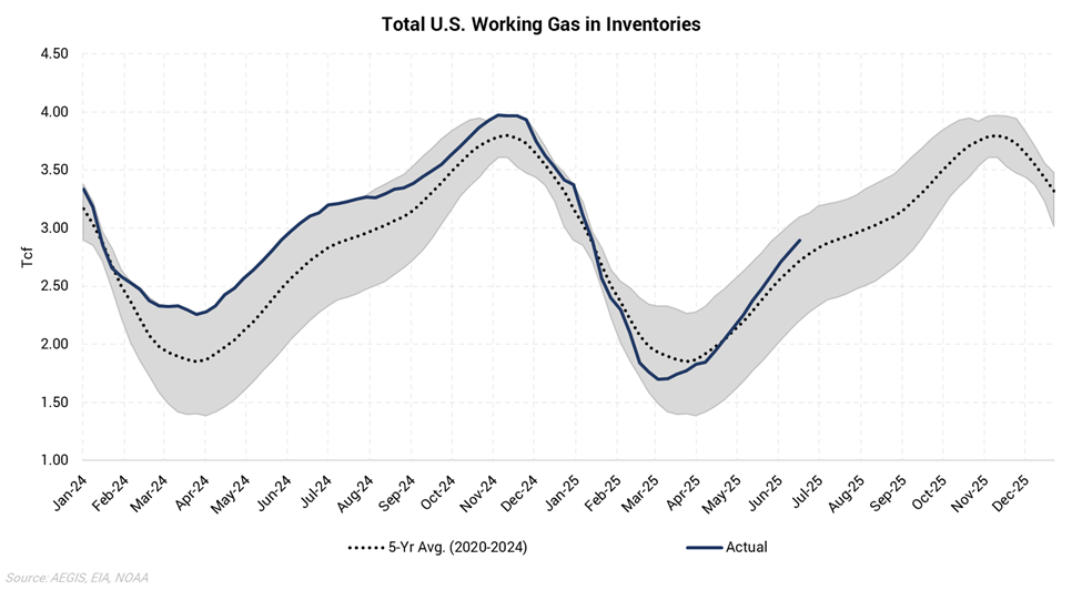 A rise is the storage level relative to the five-year average has historically meant falling prices. As the chart below shows, inventories in February/March of 2025 were 200 Bcf below the five-year average – about the same time prices were at their peak. As of late June, Inventories had ballooned to 179 Bcf over the five-year average.