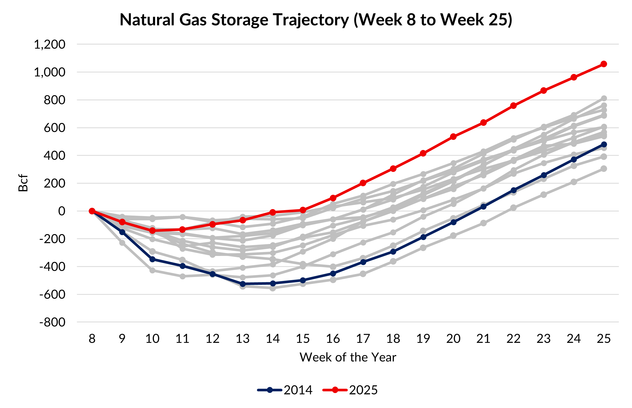 This spring, natural gas inventories have soared. There were a string of triple digit builds from late April to early June, tying the record set in 2014. The chart below shows the storage path starting in late February (week 8) to late June (week 25).