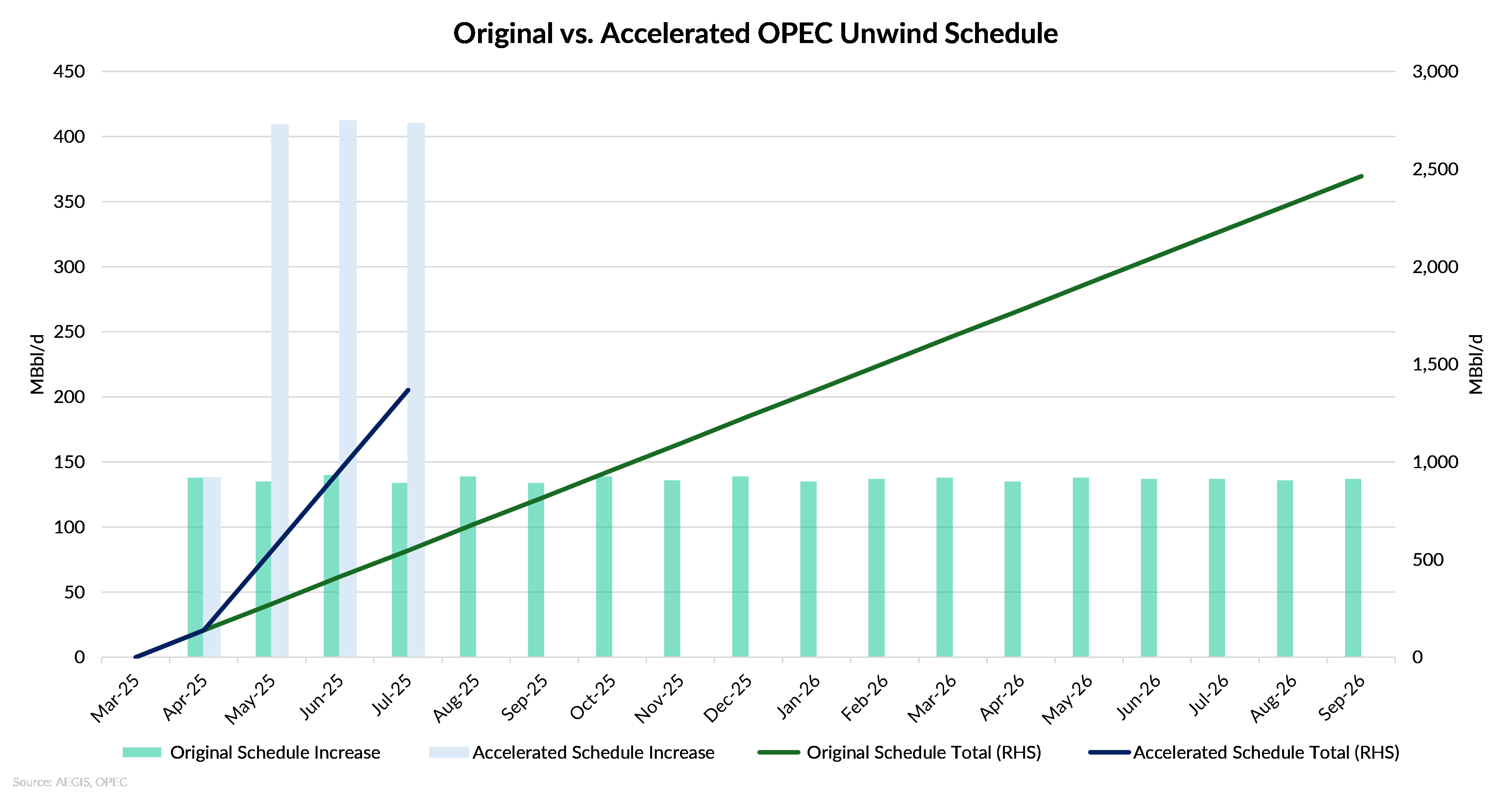 OPEC+ began unwinding supply cuts in April 2025. The plan includes a total of 2,200 MBbl/d from the broader group, along with a 300 MBbl/d increase in the UAE’s production target, bringing the combined planned return to 2.5 MMBbl/d.