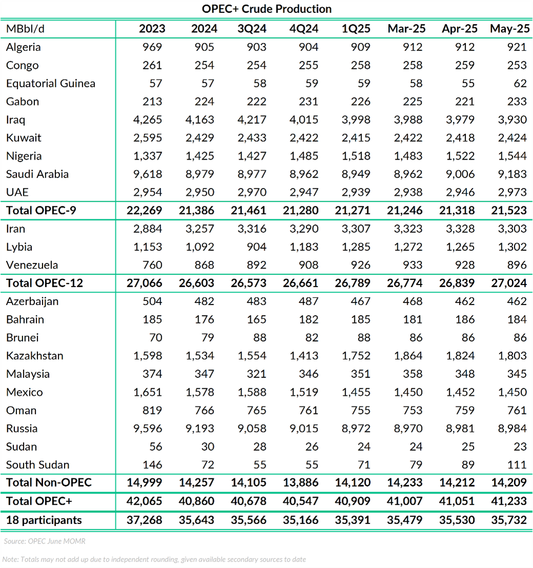 While OPEC+ has accelerated its scheduled production increases, actual output data through May indicates slower realization of these gains. Saudi Arabia has substantially driven the incremental supply growth, while several key producers remain constrained or non-compliant with compensatory cuts.