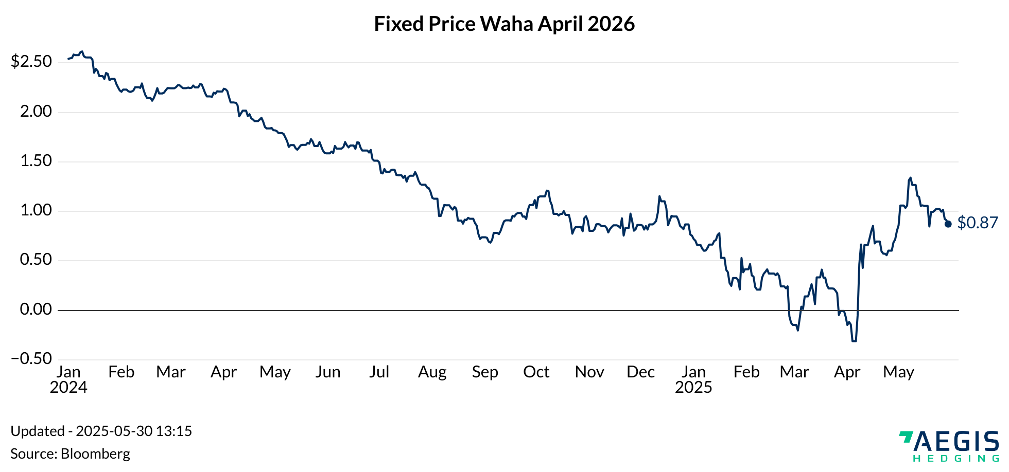 Most producers hedge Waha gas prices by simultaneously shorting Henry Hub (Nymex) and Waha basis (Platts IFERC). But there are also forward curves for the combined, fixed price. That fixed price was looking awful at near zero during March this year. But recently, there has been a rebound in Waha fixed price, where producers could use swaps to secure positive pricing.