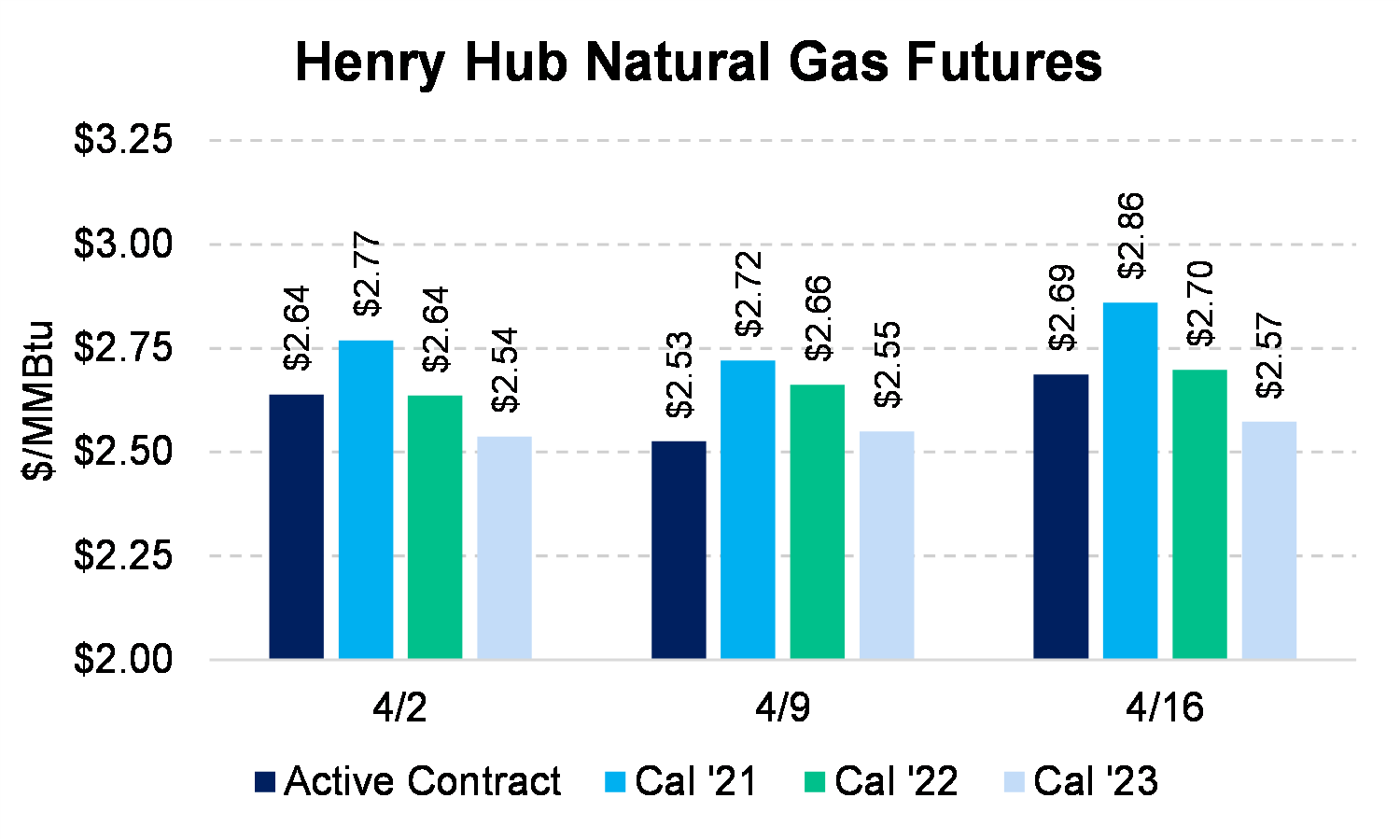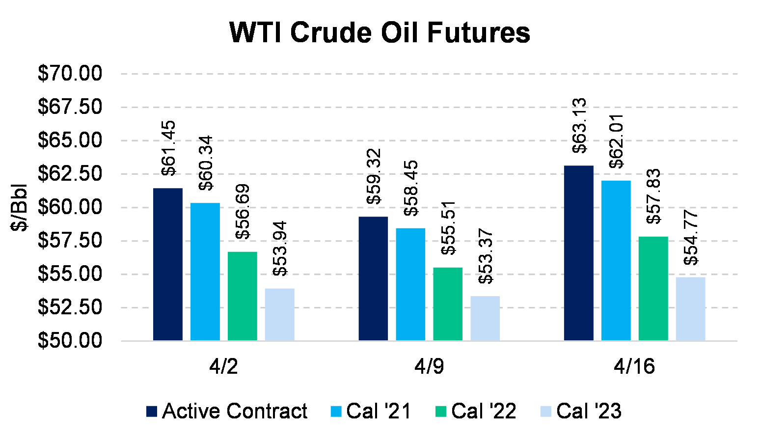 Oil prices rallied to their highest mark in about a month with WTI settling Friday at $63.13/Bbl. The oil complex received support after both the International Energy Agency (IEA) and OPEC brightened their forecasts for demand in 2021. The IEA lifted its forecast for oil consumption this year by 230 MBbl/d amid a more robust outlook for the U.S. and China. OPEC's research team now forecasts 2021 demand to rise by 5.95 MMBbl/d, a 70 MBbl/d increase from last month's outlook. Adding further support to price this week was a better-than-estimated U.S. crude oil inventory withdrawal.