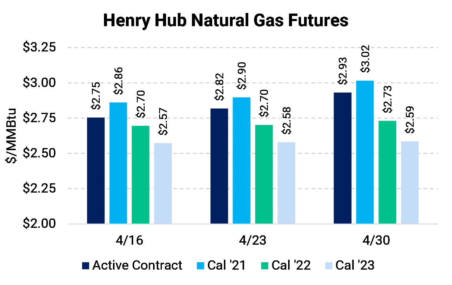 Oil prices gained 2.3% on the week to settle on Friday at $63.58 for the June WTI contract. Market participants appeared more upbeat on the global recovery in demand despite COVID hotspots like India. A report on Wednesday from Goldman Sachs likely helped buoy oil prices as the investment bank reiterated its bullish outlook for oil throughout the year. The bank forecasts Brent will reach $80/Bbl this summer amid rising demand.