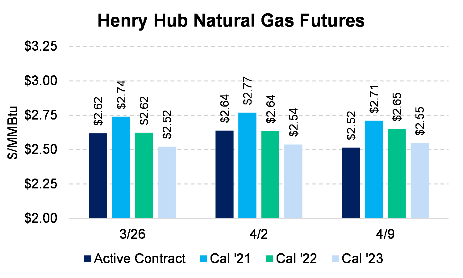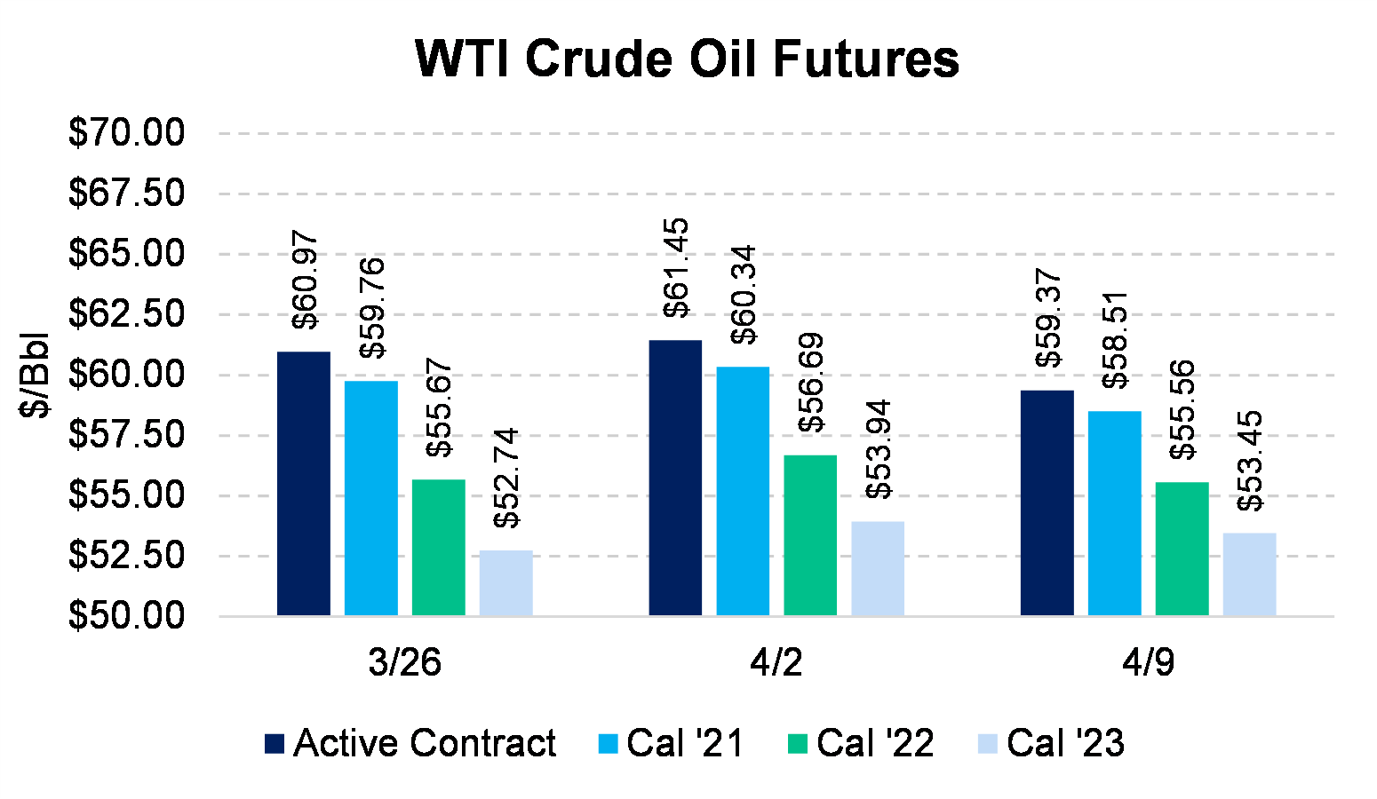 WTI finished Friday at$59.32/Bbl, a loss of $2.13 from the previous week. The May WTI contract has traded sideways for the past four weeks, settling within a $3.80 range top to bottom. The lateral price action could imply a more stable supply and demand background as OPEC+ balances production increases with a demand recovery. As oil prices have relaxed, a faster end to the OPEC+ supply cuts seems less likely.