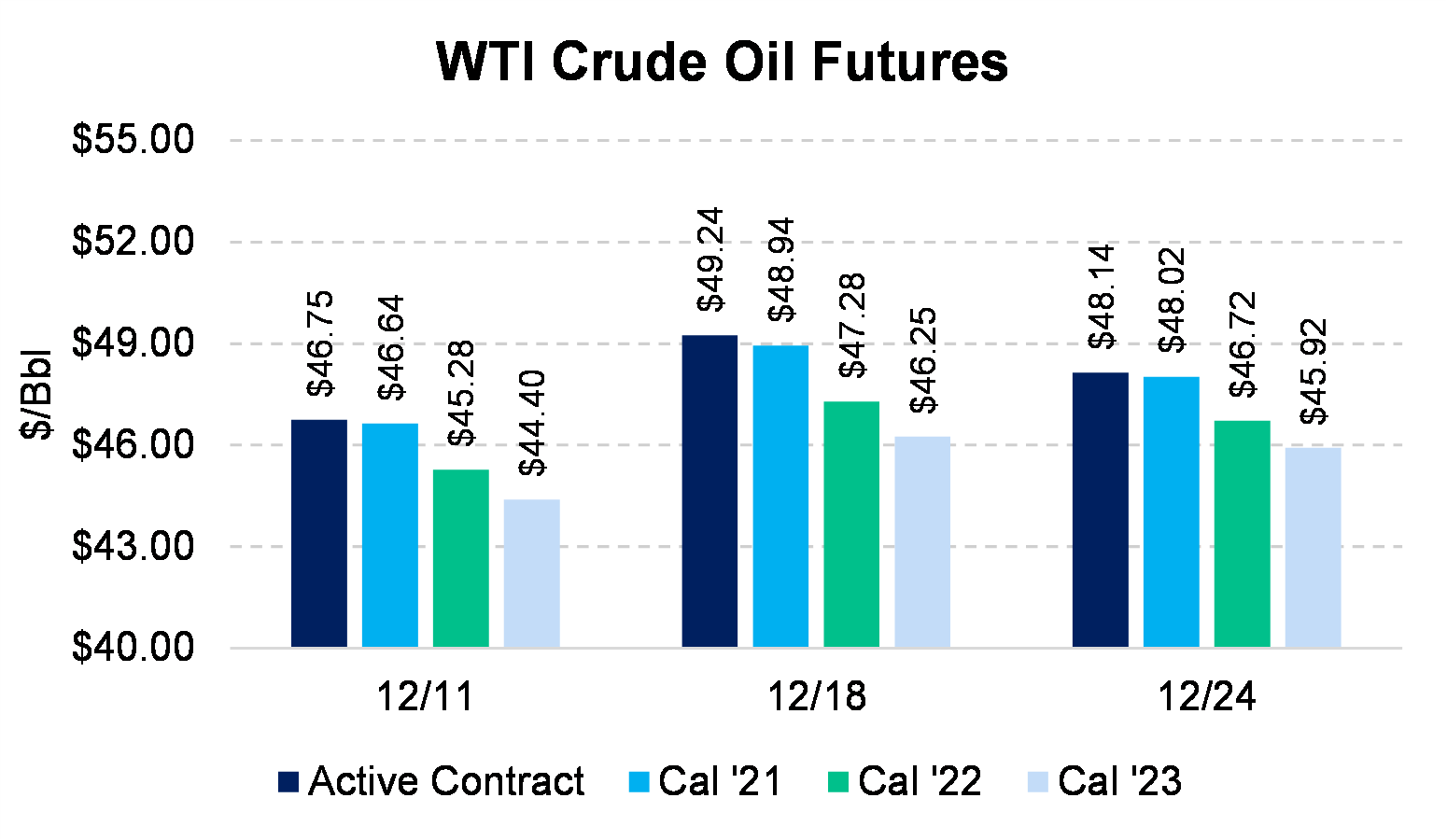 Short-term risks are too numerous to recommend using collars. With Brent around $50, we doubt OPEC+'s commitment to withholding supply. Hedging activity at AEGIS has increased with this vertical shift in the curve, implying higher realized prices for producers and more drilling activity. The U.S. dollar's weakness has artificially increased prices and could reverse. Consult the AEGIS Factor Matrix, available via the AEGIS online platform, for a full discussion.