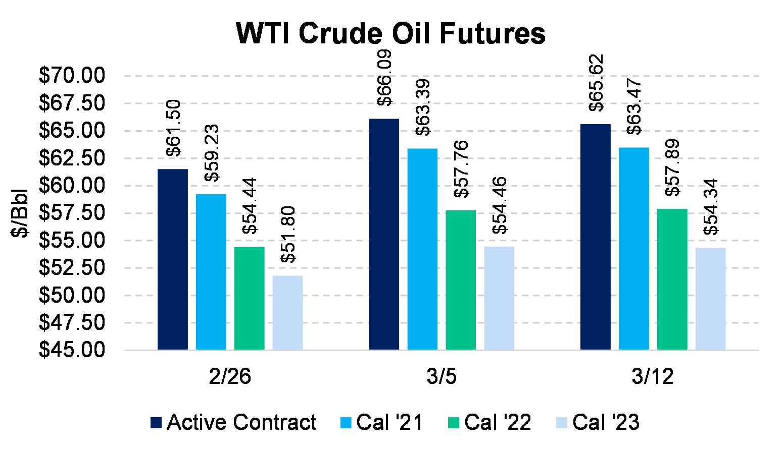 WTI settled Friday near its previous week's settlement of just over $66/Bbl. Missile attacks on Saudi Arabian oil infrastructure Sunday, March 7, sent WTI soaring intraday to $68/Bbl before giving up all gains, plus some after reports showed the attacks did not affect Saudi oil production.