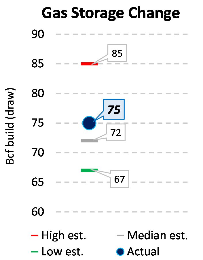 EIA reported a build of 75 Bcf for the week ending 10/02/2020. This was larger than the median estimate of 72 Bcf. Today's stat fell within the expected range, which was 85 Bcf on the more bearish end, and 67 Bcf on the more bullish end.