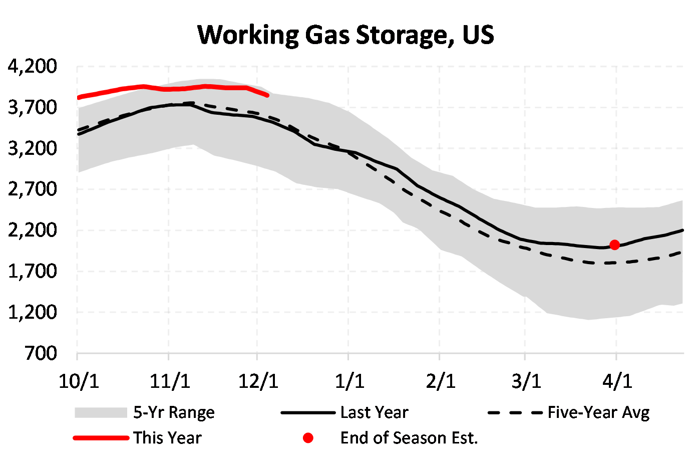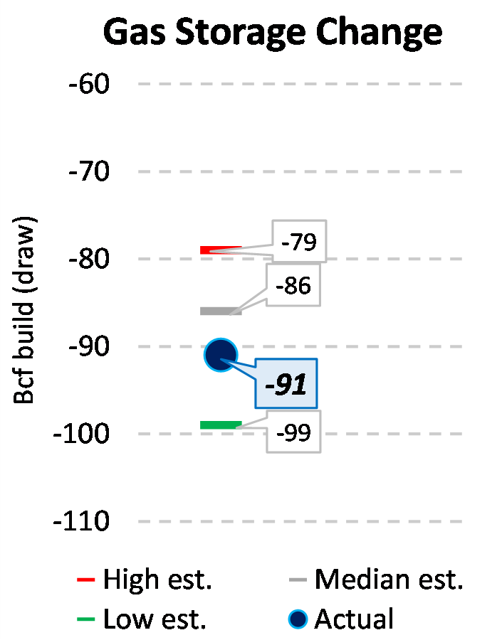 EIA reported a draw of -91 Bcf for the week ending 12/04/2020. This was larger than the median estimate of -86 Bcf. Today's stat fell within the expected range, which was -79 Bcf on the more bearish end, and -99 Bcf on the more bullish end.