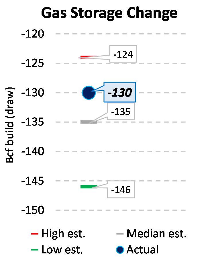 EIA reported a draw of -130 Bcf for the week ending 1/01/2021. This was smaller than the median estimate of -135 Bcf. Today's stat fell within the expected range, which was -124 Bcf on the more bearish end, and -146 Bcf on the more bullish end.