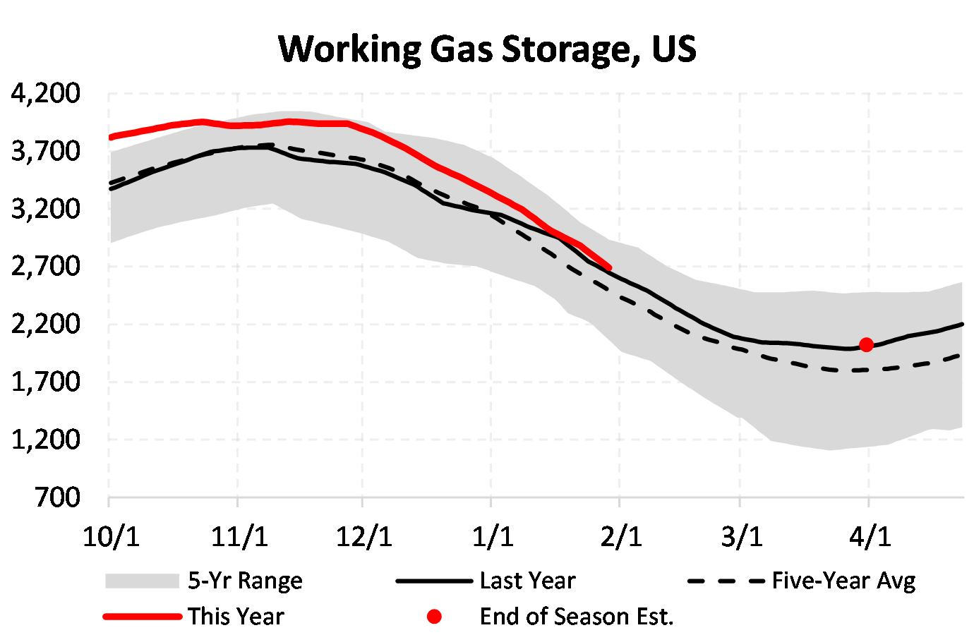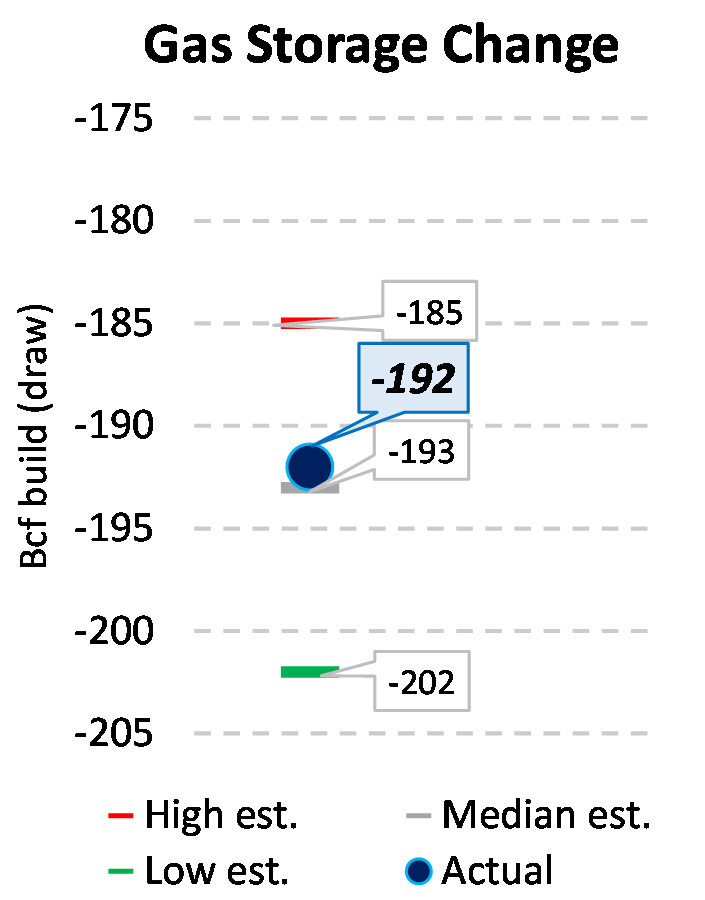 EIA reported a draw of -192 Bcf for the week ending 1/29/2021. This was smaller than the median estimate of -193 Bcf. Today's stat fell within the expected range, which was -185 Bcf on the more bearish end, and -202 Bcf on the more bullish end.