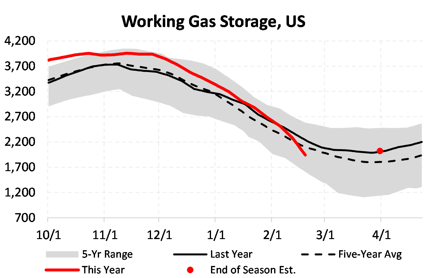 AEGIS notes the draw was the second-largest of all time, 20-Bcf shy of the all-time record of -359 Bcf in January '18. This week's strong pull on inventories brings storage levels in-line with the five-year average for the first time since January '20.