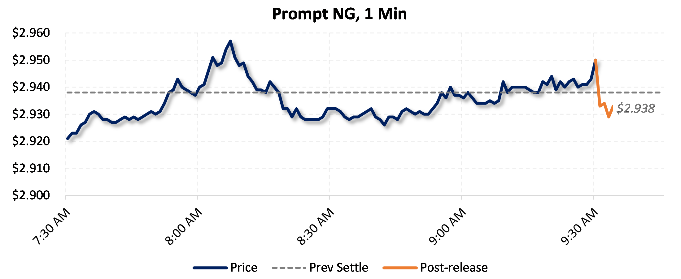 Prices were down in the five minutes following the announcement, to $2.933, from $2.939 just before 9:30am.