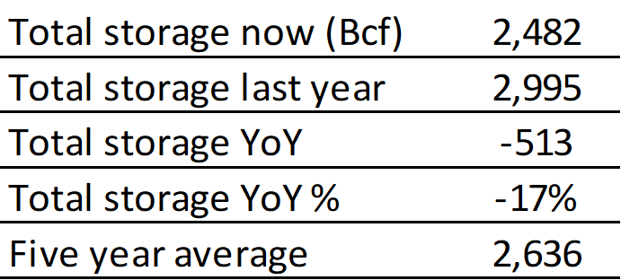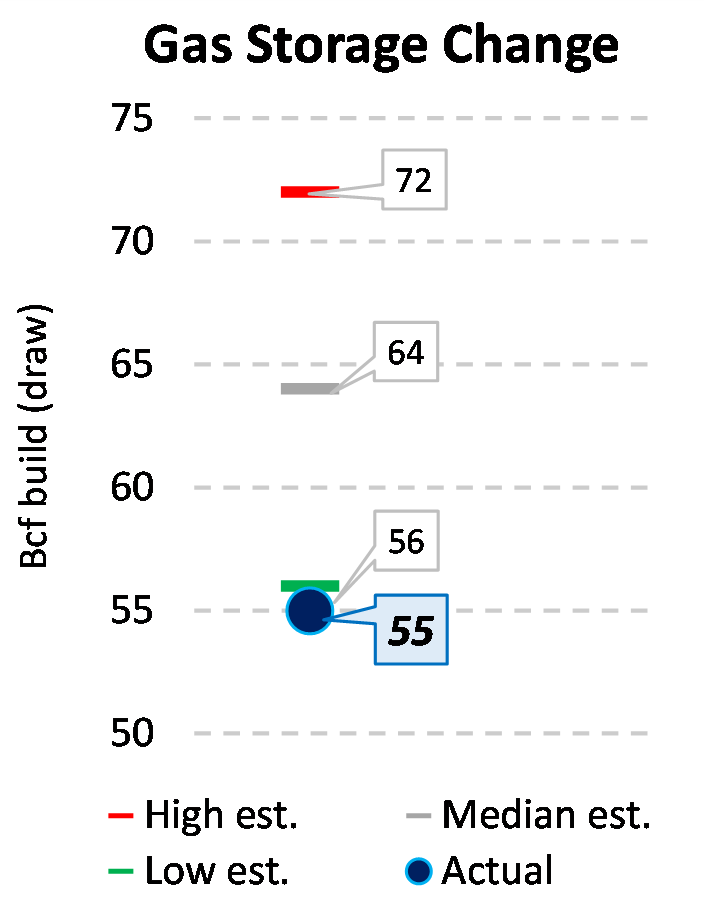 EIA reported a build of 55 Bcf for the week ending 6/18/2021. This was smaller than the median estimate of 64 Bcf. Today's stat fell outside the expected range, which was 72 Bcf on the more bearish end, and 56 Bcf on the more bullish end.