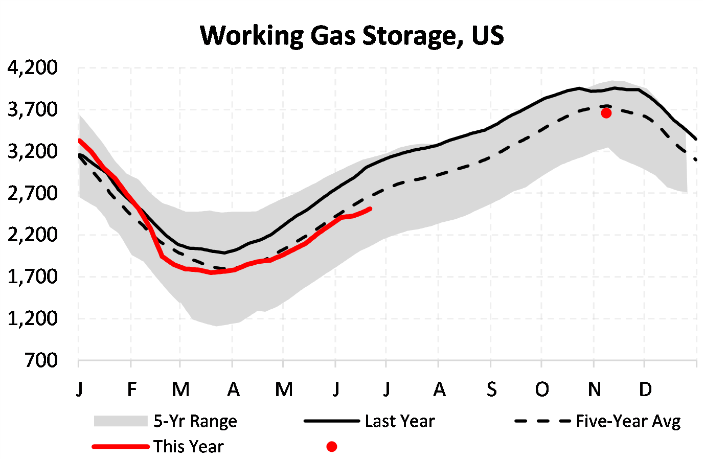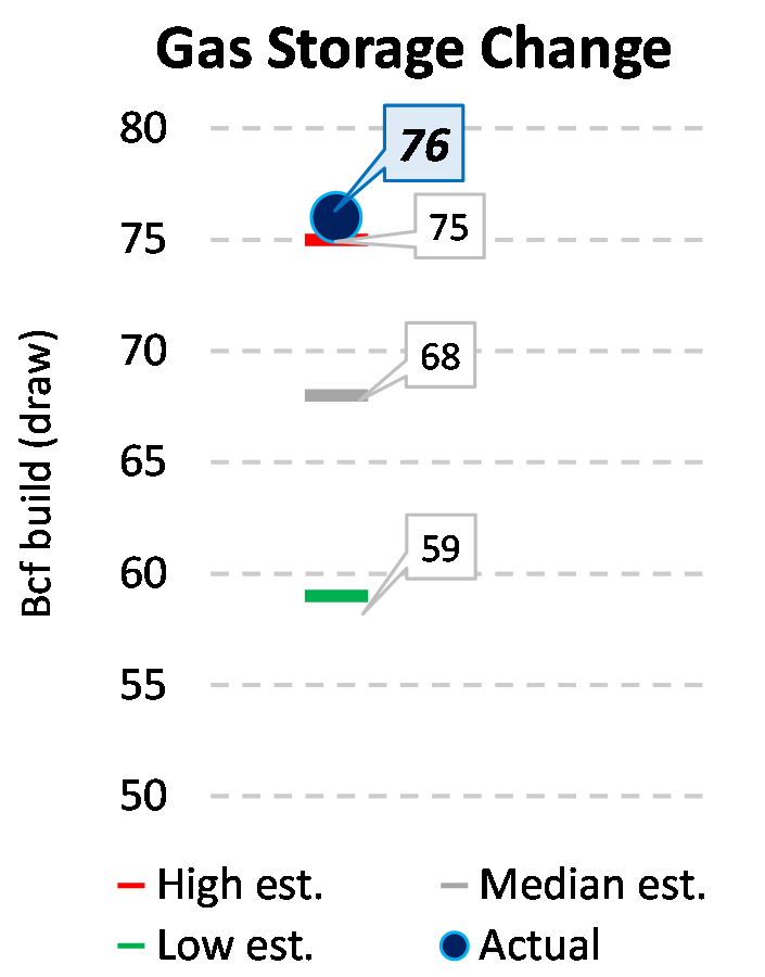 EIA reported a build of 76 Bcf for the week ending 6/25/2021. This was larger than the median estimate of 68 Bcf. Today's stat fell outside the expected range, which was 75 Bcf on the more bearish end, and 59 Bcf on the more bullish end.