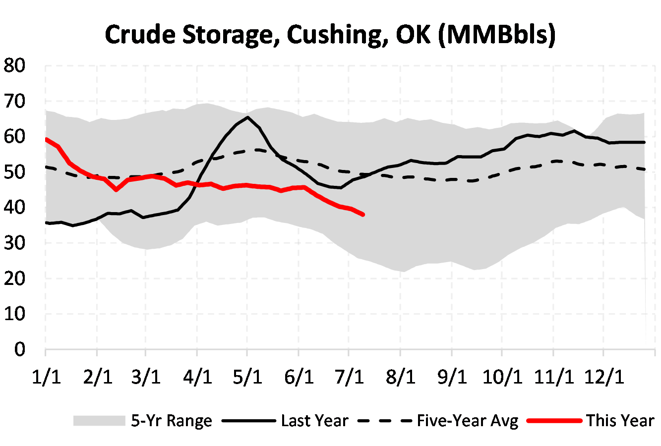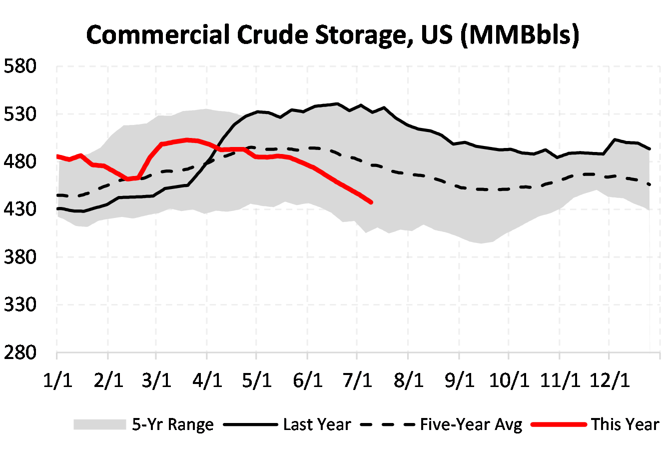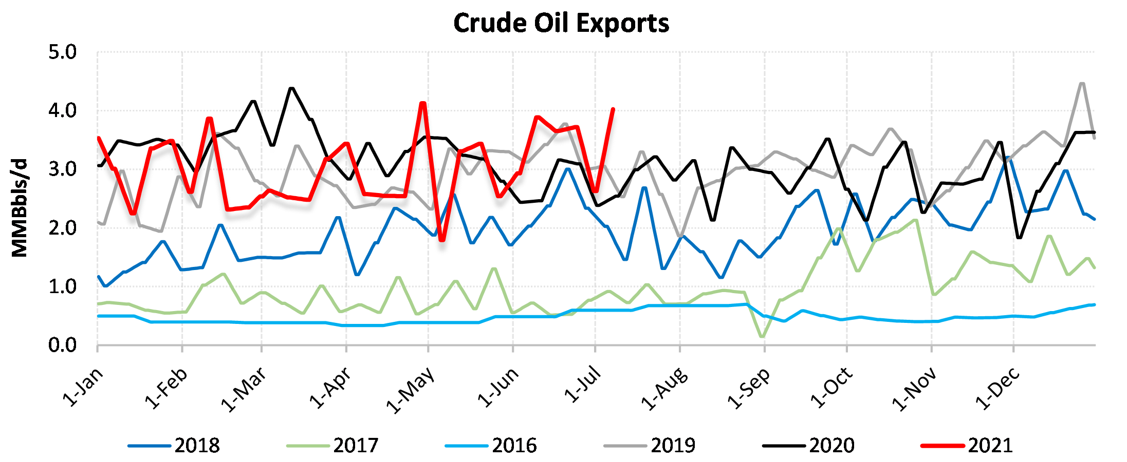 EIA reported a draw of -7896 MBbls in U.S. crude-oil inventories for the week ending 7/9/2021. This was larger than the average estimate of -4357 MBbls as reported by Bloomberg.