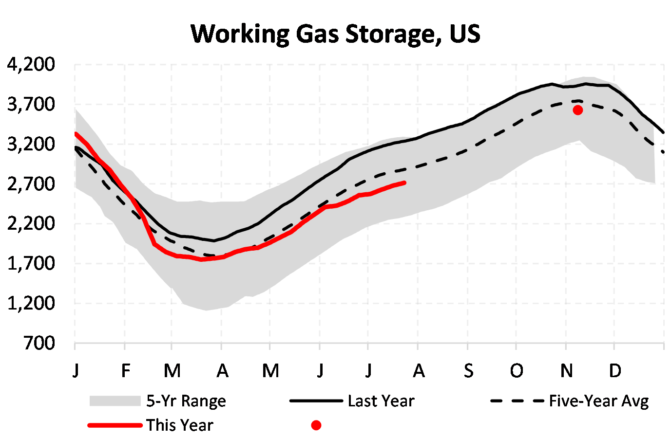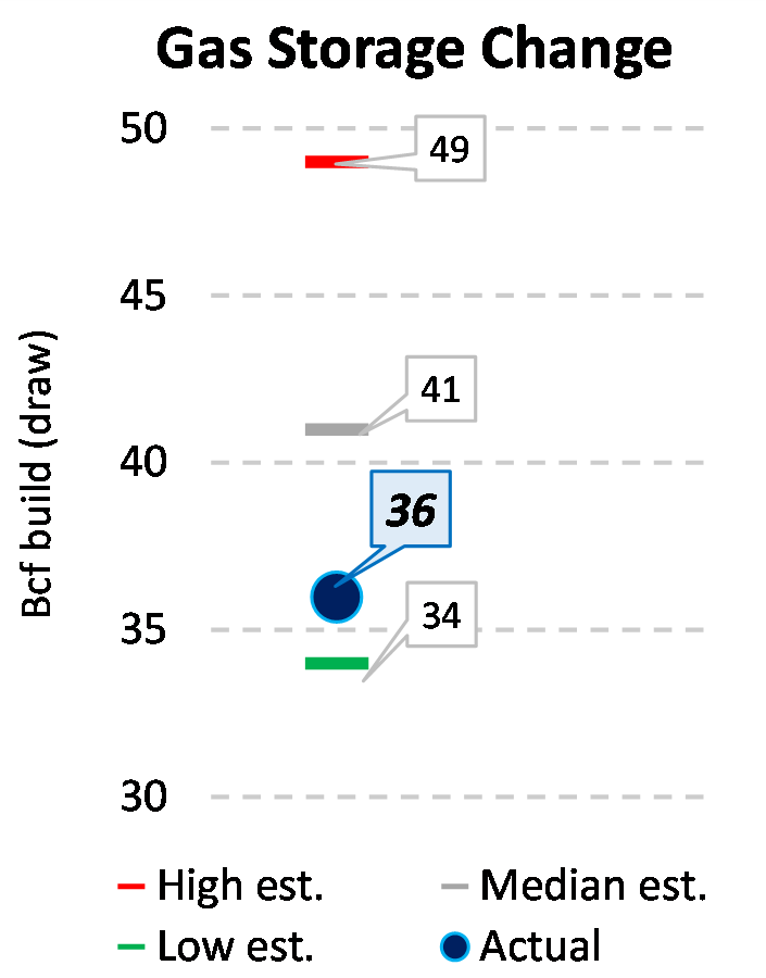 EIA reported a build of 36 Bcf for the week ending 7/23/2021. This was smaller than the median estimate of 41 Bcf. Today's stat fell within the expected range, which was 49 Bcf on the more bearish end, and 34 Bcf on the more bullish end.