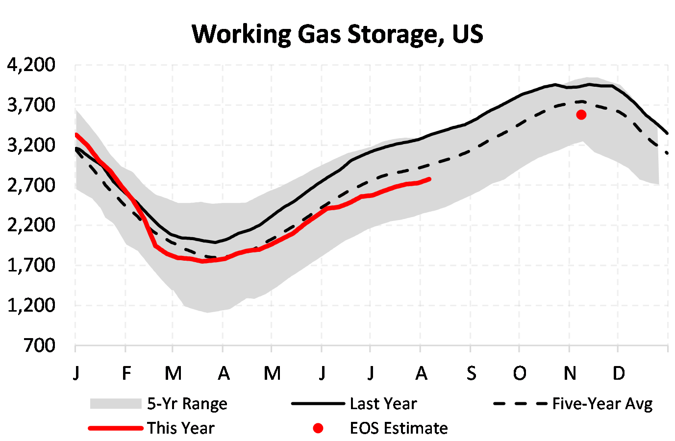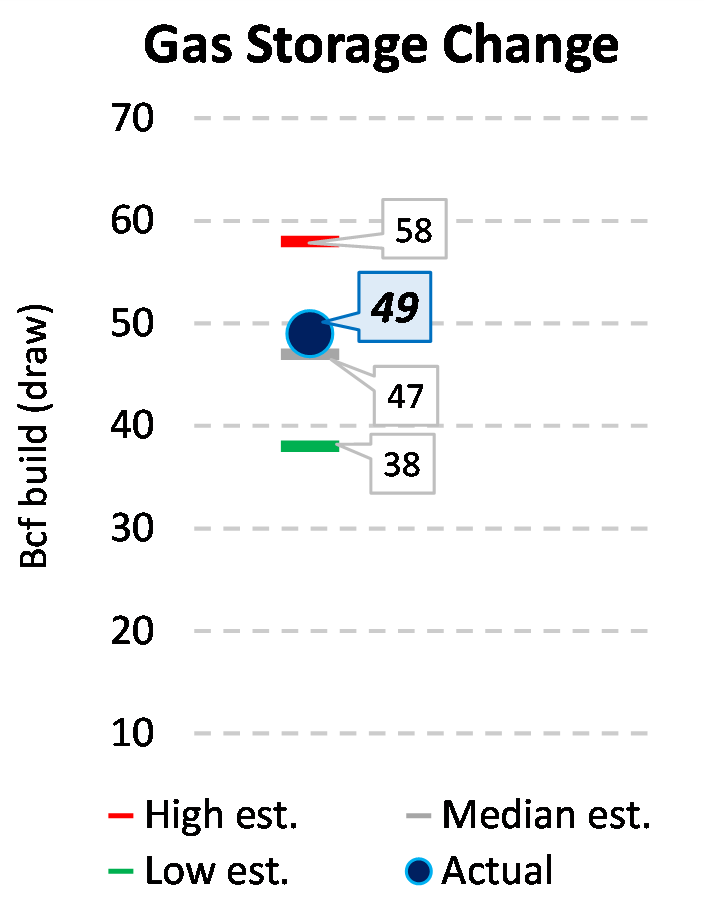 EIA reported a build of 49 Bcf for the week ending 8/06/2021. This was larger than the median estimate of 47 Bcf. Today's stat fell within the expected range, which was 58 Bcf on the more bearish end, and 38 Bcf on the more bullish end.