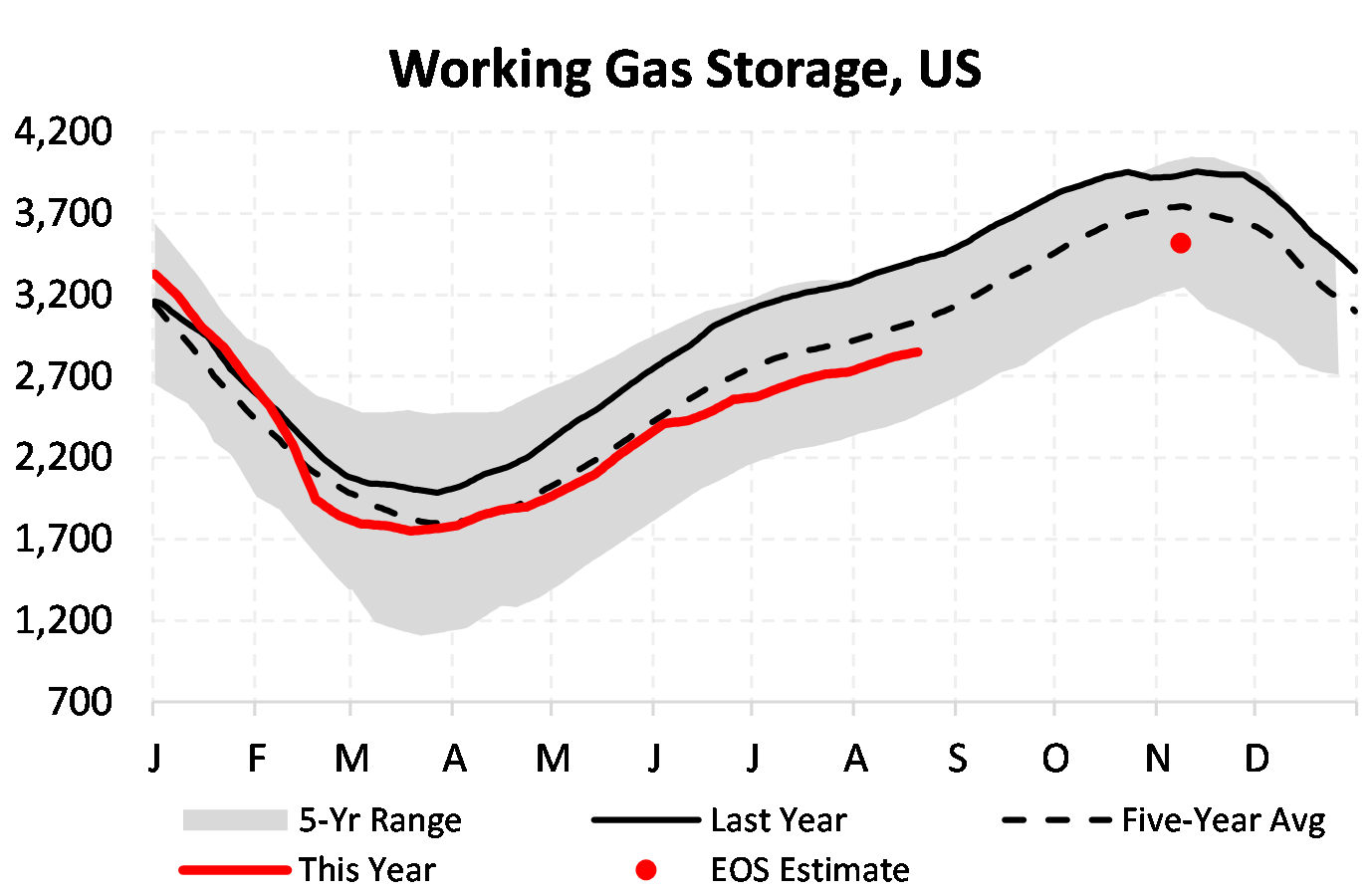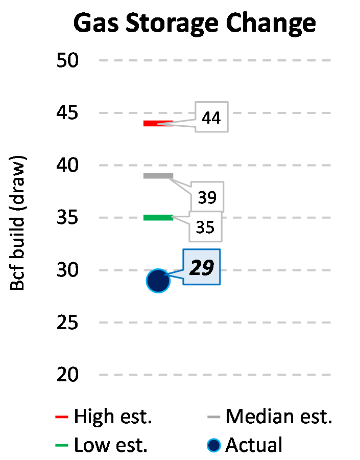 EIA reported a build of 29 Bcf for the week ending 8/20/2021. This was smaller than the median estimate of 39 Bcf. Today's stat fell outside the expected range, which was 44 Bcf on the more bearish end, and 35 Bcf on the more bullish end.