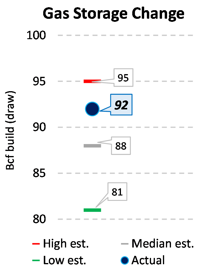 EIA reported a build of 92 Bcf for the week ending 10/15/2021. This was larger than the median estimate of 88 Bcf. Today's stat fell within the expected range, which was 95 Bcf on the more bearish end, and 81 Bcf on the more bullish end.