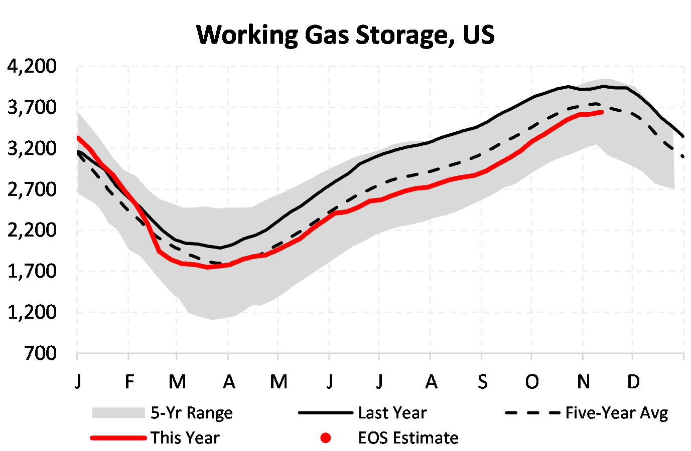 EIA reported a build of 26 Bcf for the week ending 11/12/2021. This was larger than the median estimate of 24 Bcf. Today's stat fell within the expected range, which was 33 Bcf on the more bearish end, and 19 Bcf on the more bullish end.