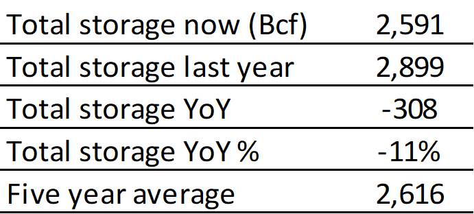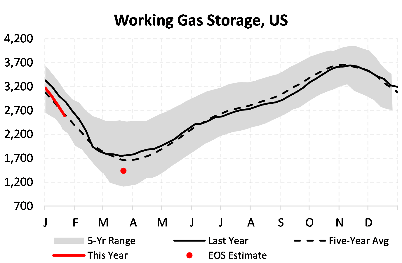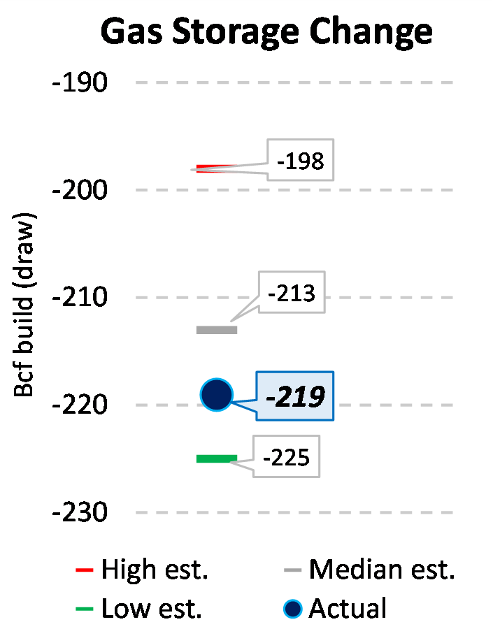 EIA reported a draw of -219 Bcf for the week ending 1/21/2022. This was larger than the median estimate of -213 Bcf. Today's stat fell within the expected range, which was -198 Bcf on the more bearish end, and -225 Bcf on the more bullish end.