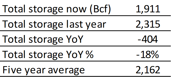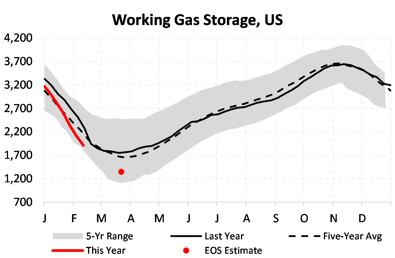 EIA reported a draw of -190 Bcf for the week ending 2/11/2022. This was smaller than the median estimate of -195 Bcf. Today's stat fell within the expected range, which was -182 Bcf on the more bearish end, and -204 Bcf on the more bullish end.