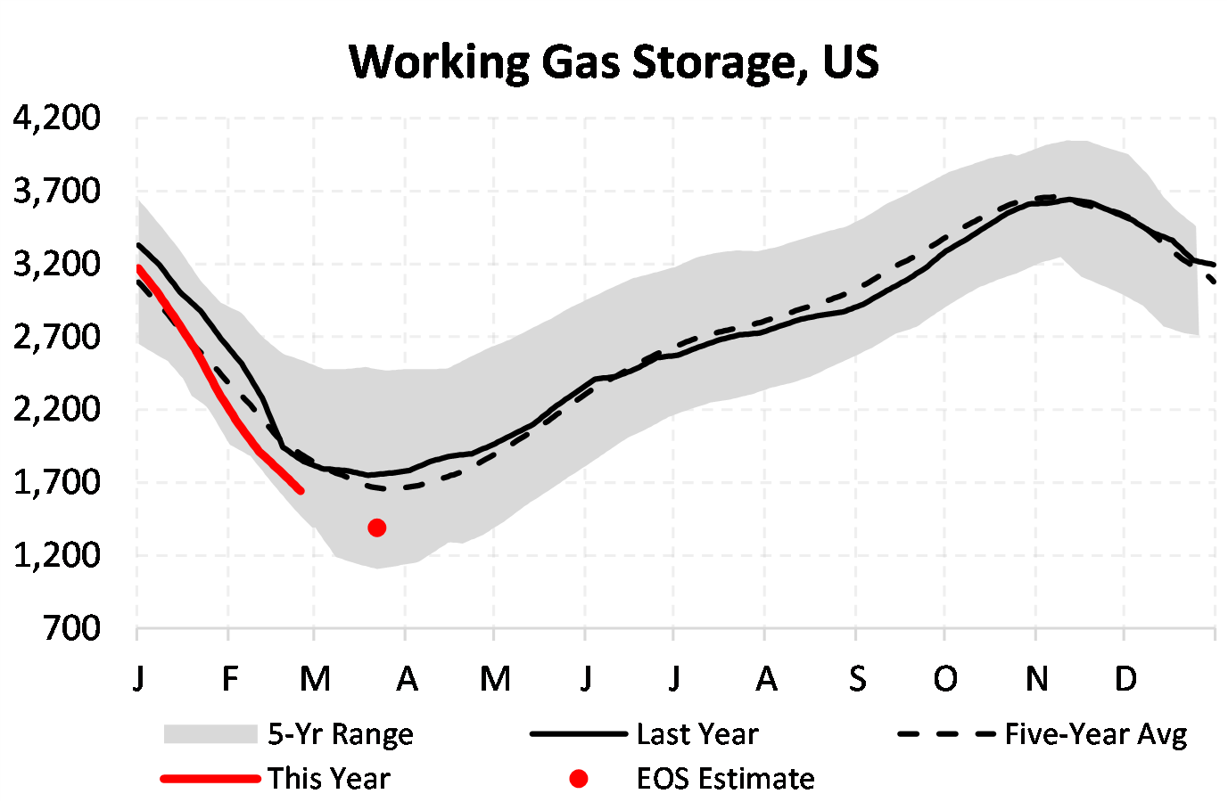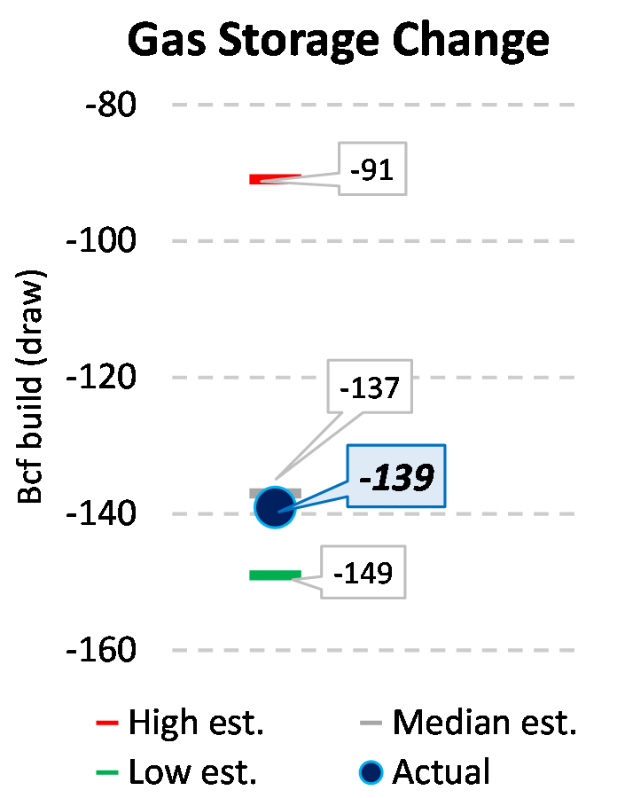 EIA reported a draw of -139 Bcf for the week ending 2/25/2022. This was larger than the median estimate of -137 Bcf. Today's stat fell within the expected range, which was -91 Bcf on the more bearish end, and -149 Bcf on the more bullish end.