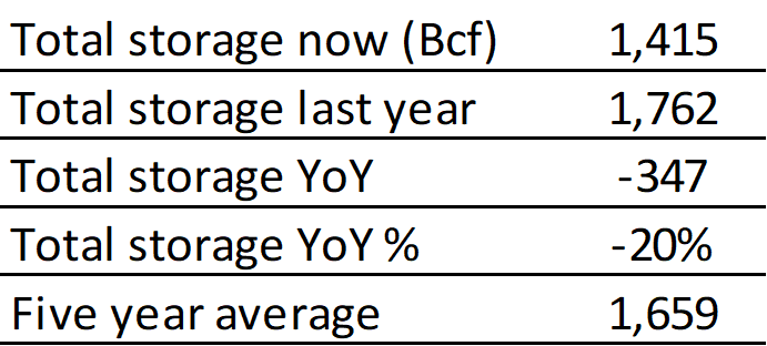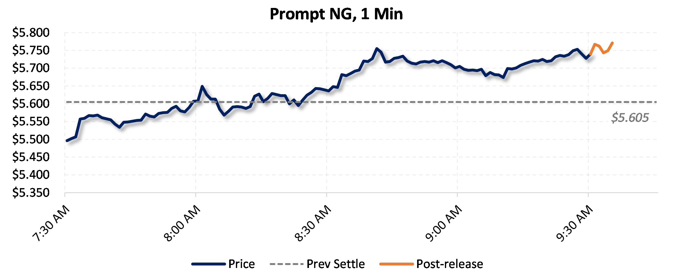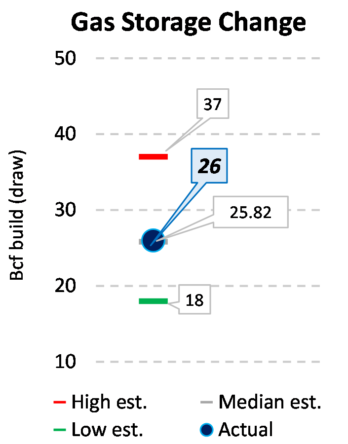 EIA reported a build of 26 Bcf for the week ending 3/25/2022. This was larger than the median estimate of 25.82 Bcf. Today's stat fell within the expected range, which was 37 Bcf on the more bearish end, and 18 Bcf on the more bullish end.