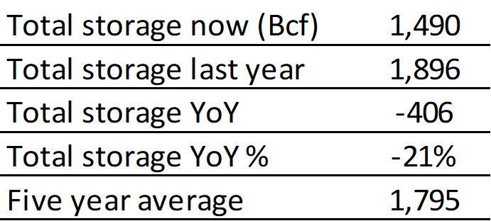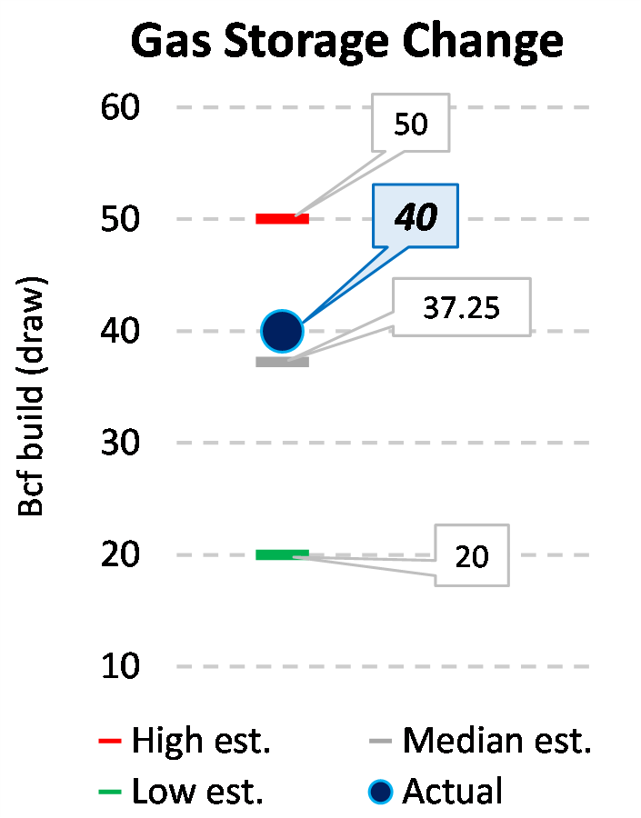 EIA reported a build of 40 Bcf for the week ending 4/22/2022. This was larger than the median estimate of 37.25 Bcf. Today's stat fell within the expected range, which was 50 Bcf on the more bearish end, and 20 Bcf on the more bullish end.