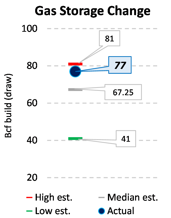 EIA reported a build of 77 Bcf for the week ending 4/29/2022. This was larger than the median estimate of 67.25 Bcf. Today's stat fell within the expected range, which was 81 Bcf on the more bearish end, and 41 Bcf on the more bullish end.